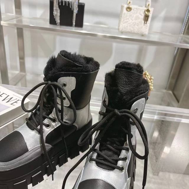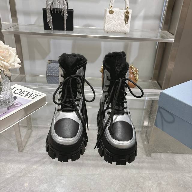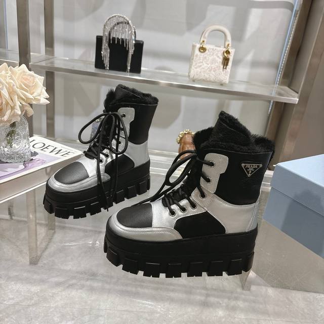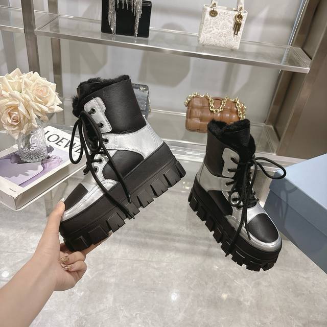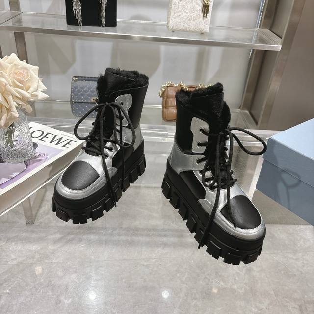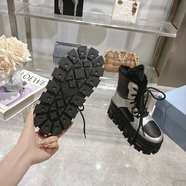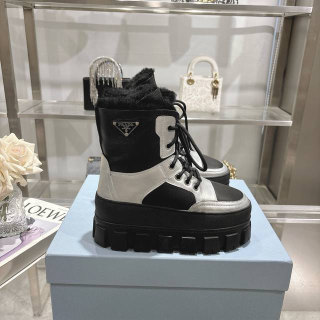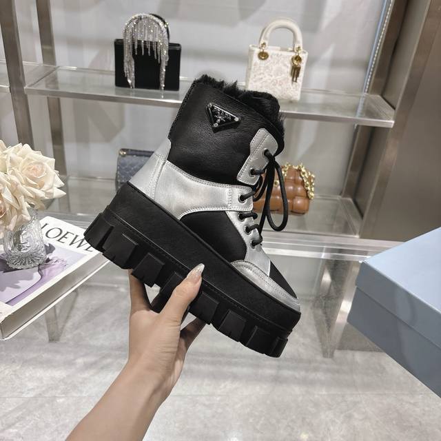 最新Prada普拉达:新奇别致的柔软牛皮面,纯羊毛里,独特的设计的风格,为此款复古风雪地靴注入心裁别出的设计巧思 4.5厘米橡胶鞋底 涂珐琅金属配件 凹凸鞋底花