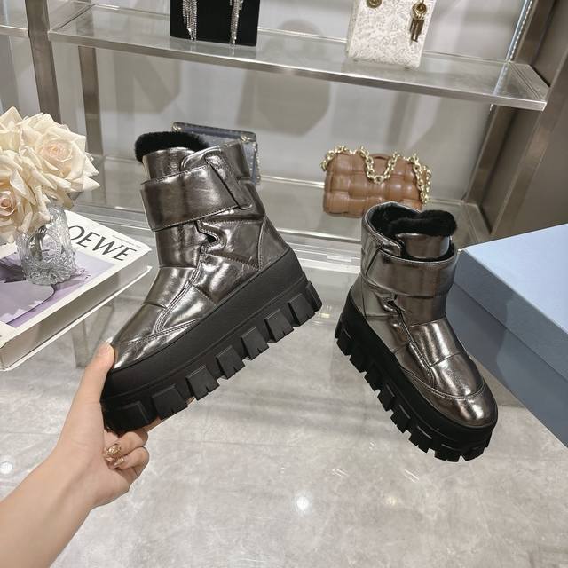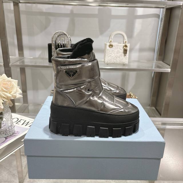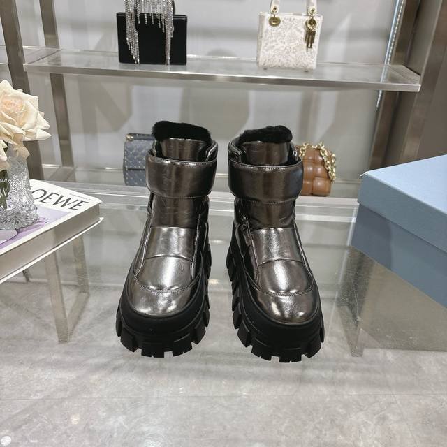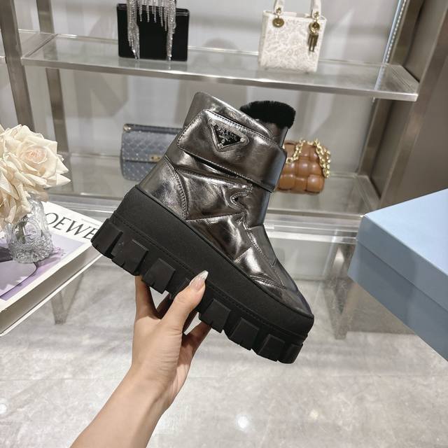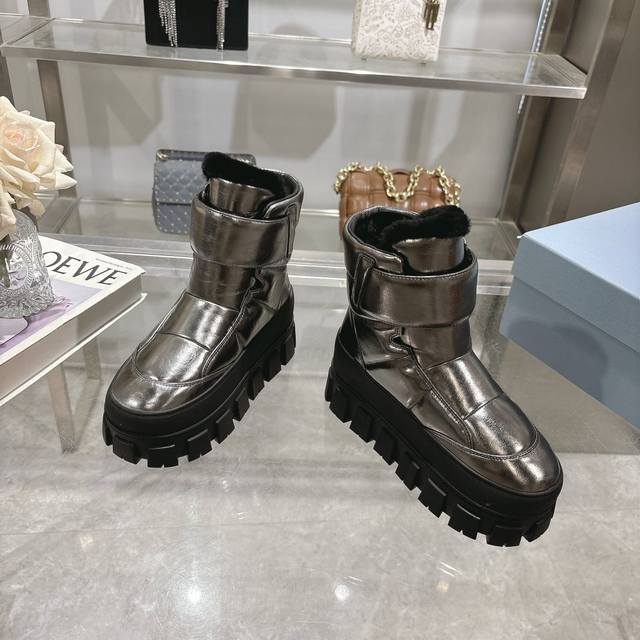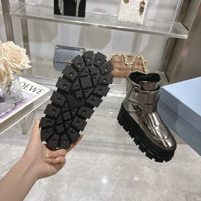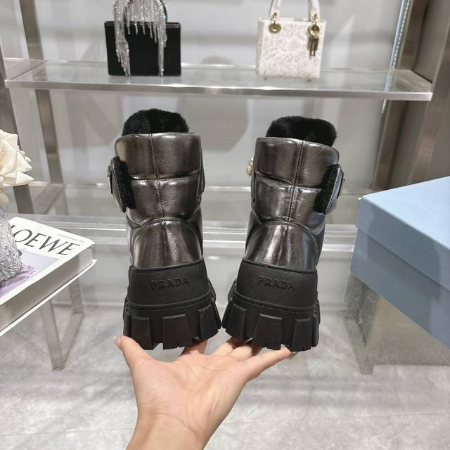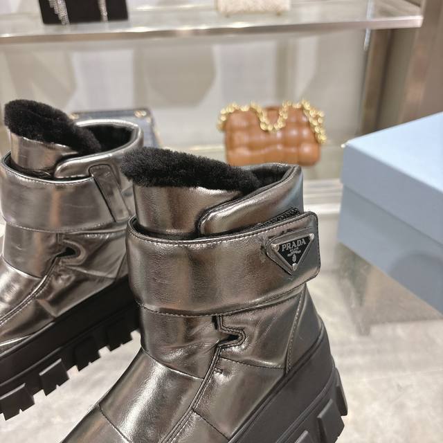 最新Prada普拉达:新奇别致的柔软牛皮面,纯羊毛里,独特的设计的风格,为此款复古风雪地靴注入心裁别出的设计巧思 4.5厘米橡胶鞋底 涂珐琅金属配件 凹凸鞋底花
