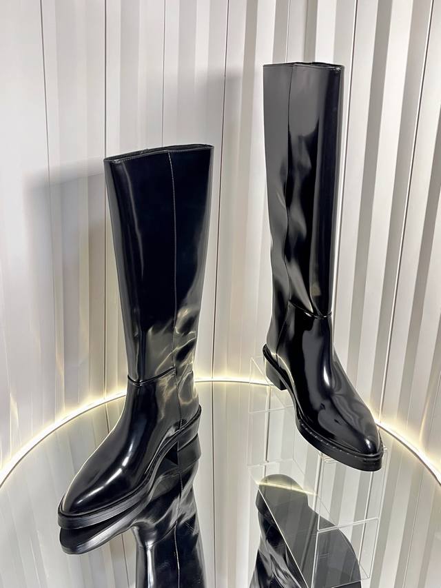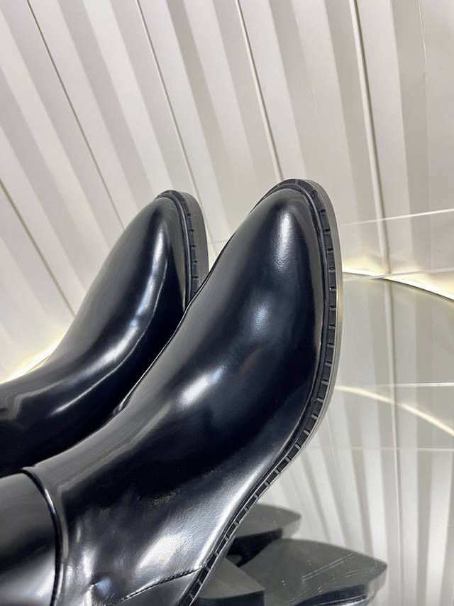 秋冬新款Prada普拉达尖头三角标直筒骑士靴马丁靴 这款皮革靴撷取简约美学风格,诠释当代设计精髓,塑就丰盈立体的廓形。流畅构型与金属刻字徽标彰显鲜明个性。 鞋面