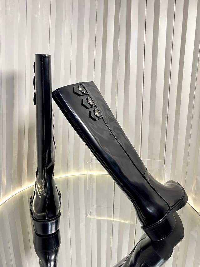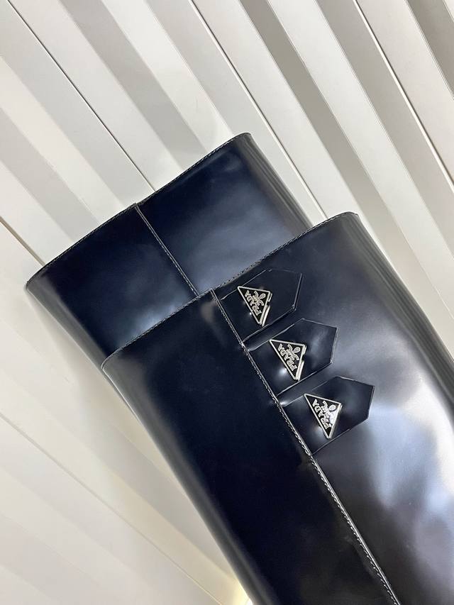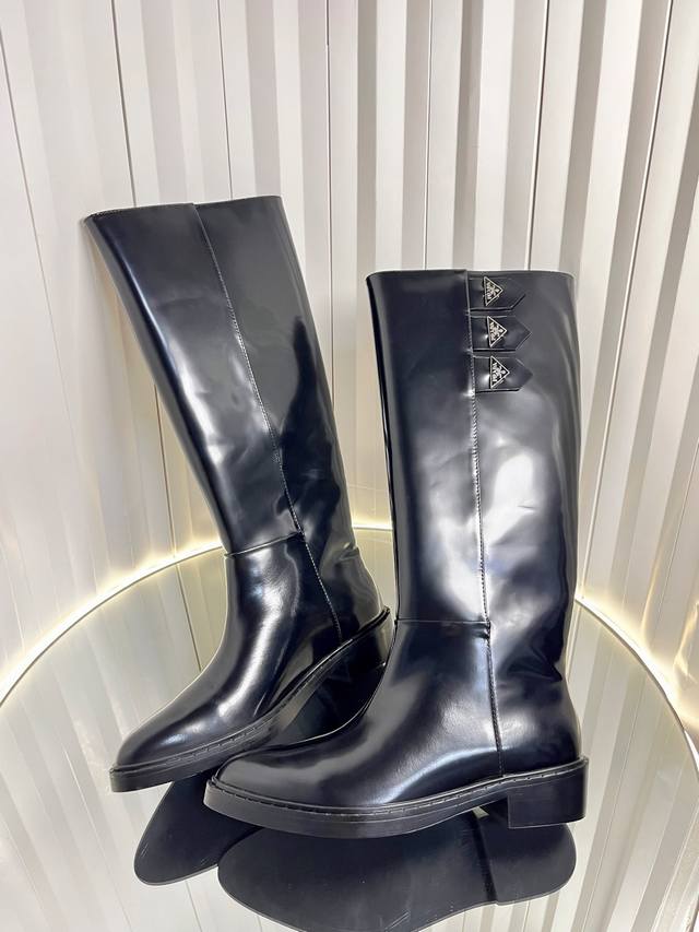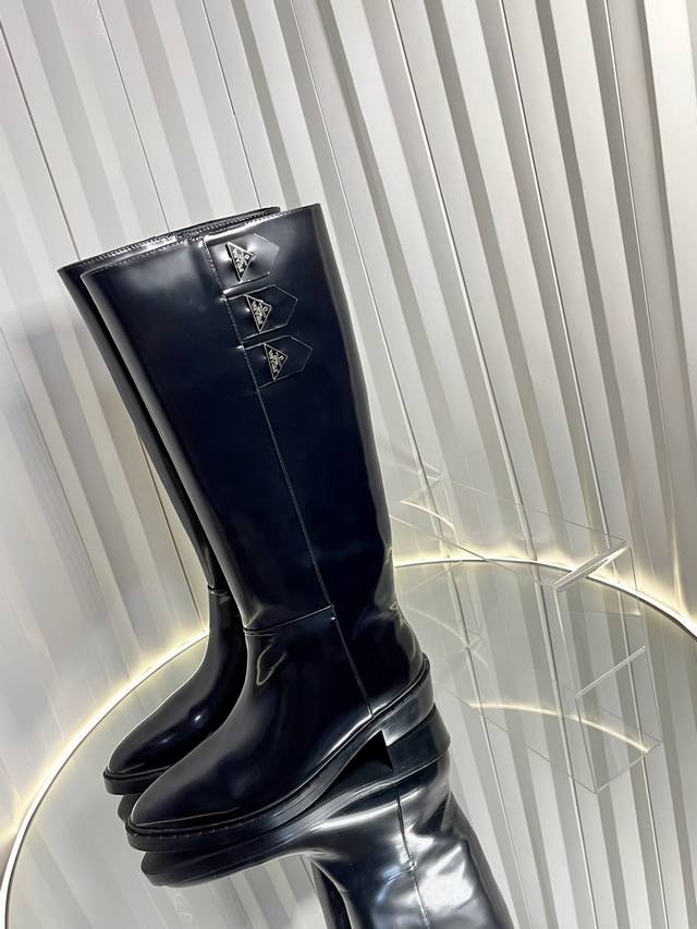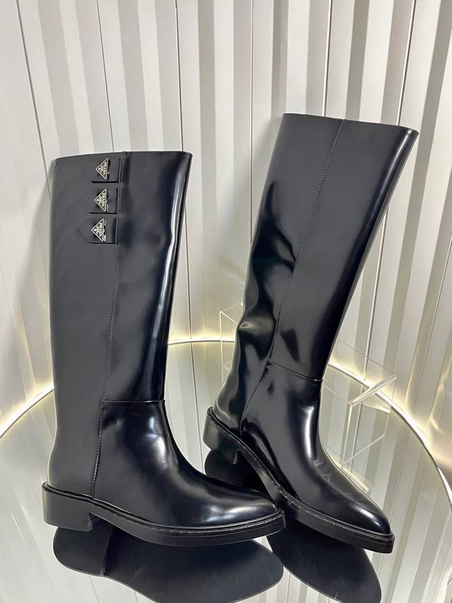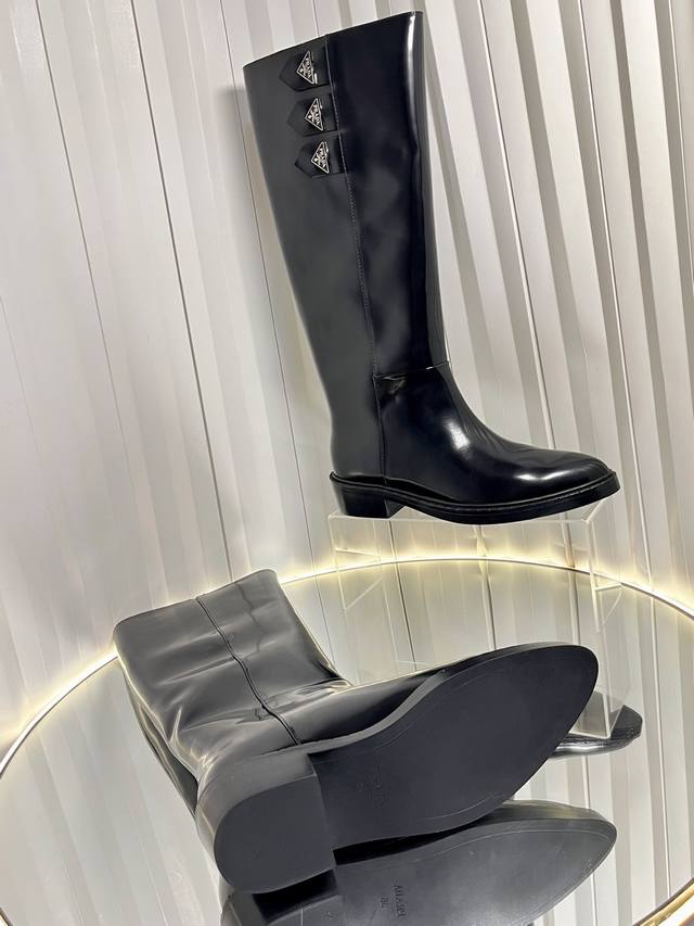 / 秋冬新款Prada普拉达尖头三角标直筒骑士靴马丁靴 这款皮革靴撷取简约美学风格,诠释当代设计精髓,塑就丰盈立体的廓形。流畅构型与金属刻字徽标彰显鲜明个性。 鞋面
