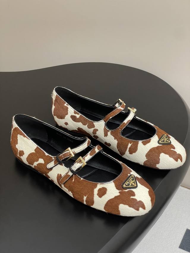 25Ss早春新款prada普拉达奶牛马毛平底单鞋玛丽珍芭蕾舞鞋