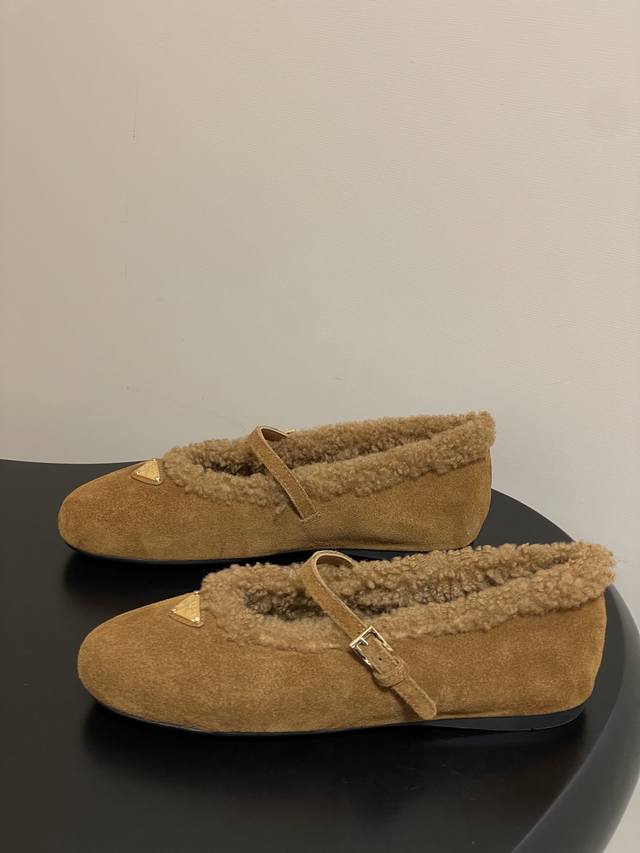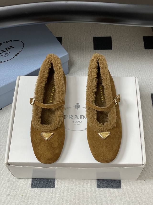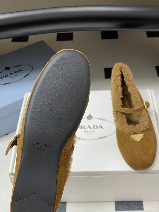 顶级品质 配飞机盒 DDD 25Ss早秋新款prada普拉达麂皮绒面芭蕾舞平底鞋毛毛里玛丽珍保暖芭蕾舞单鞋 DDD 这款麂皮绒面芭蕾平底鞋以锥形轮廓展现出优雅魅力。采用圆头设计,经典线条搭配雅致细节,饰有涂珐琅三角形金属徽标。 DDD 鞋面点缀饰带与雕刻徽标金属搭扣 DDD 涂珐琅三角形金属徽标 DDD 5毫米一体式鞋底,饰有热压徽标 DDD 鞋面:高丝光牛反绒 DDD 垫脚内里:羊毛 DDD 跟高:平底 DDD 鞋底:原版开模橡胶大底 DDD 码数:35-39 40.41定做不退换 DDD