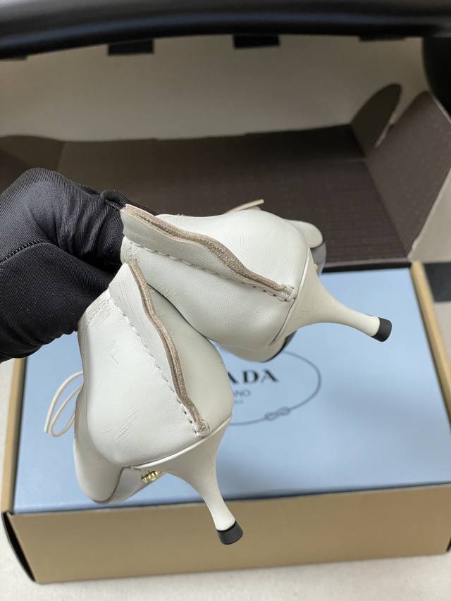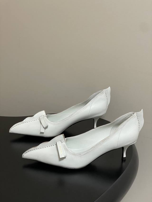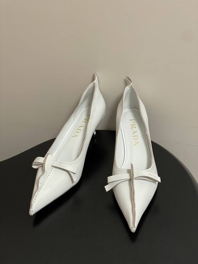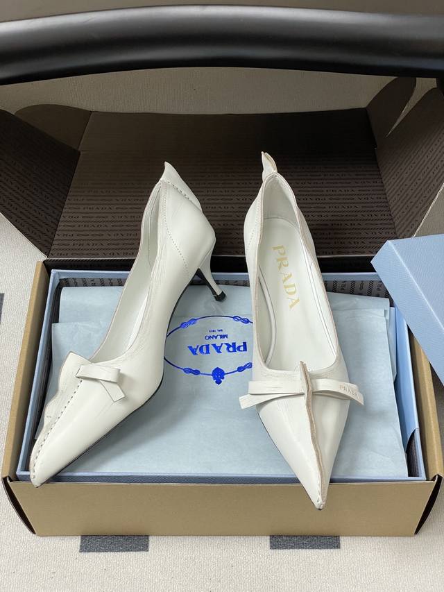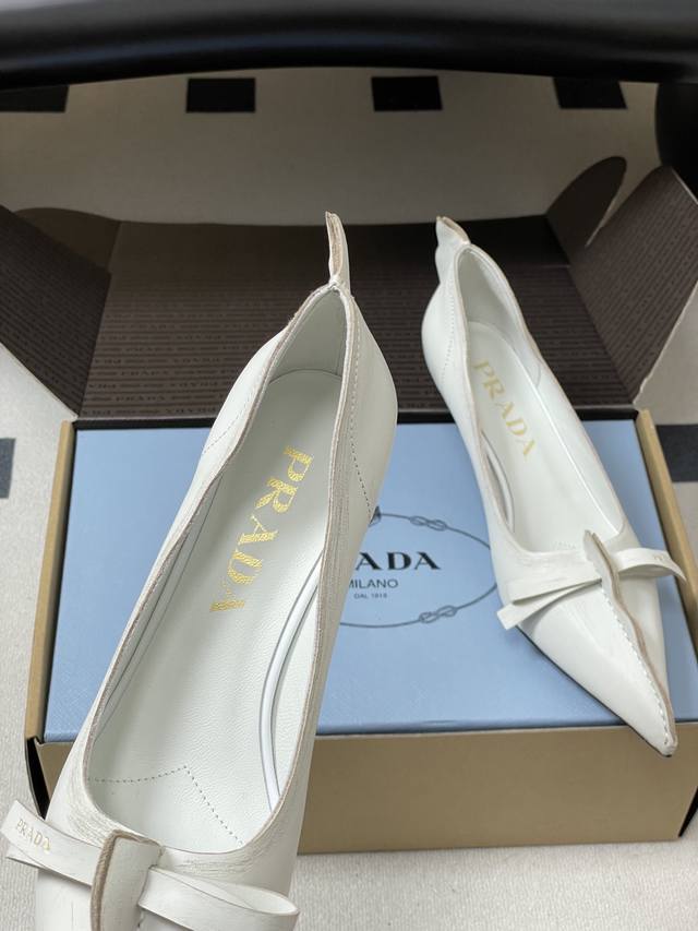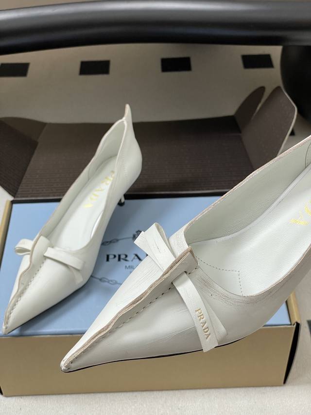 顶级品质 配高档飞机盒 DDD 25Aw早秋新款prada 普拉达走秀款尖头做旧蝴蝶结高跟鞋 复古老钱风小猫跟单鞋 DDD 未来科技感满满 时尚界久违的极简之美 时髦又精致 日常穿出高级感 DDD 强烈的线条和大胆的细节将象征女性魅力的高跟鞋转变为独特而非传统的设计。尖头廓形采用做旧皮革,具有明显的缝线和故意未完成的原始切割边缘。精致的细高跟完美呈现出此款鞋履的多面风格。 DDD 选用优质皮革材质,质感高级,且有做旧效果的纹理,呈现出复古又摩登的质感,工艺精细,体现品牌高端品质。细高跟设计,提升穿着者气场