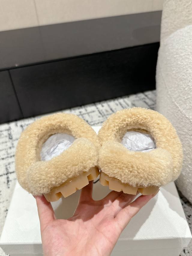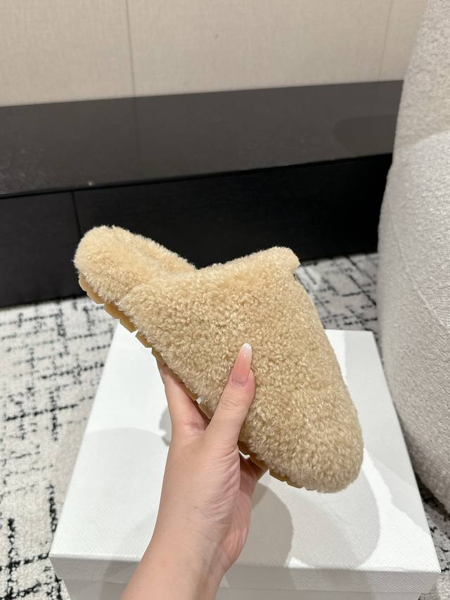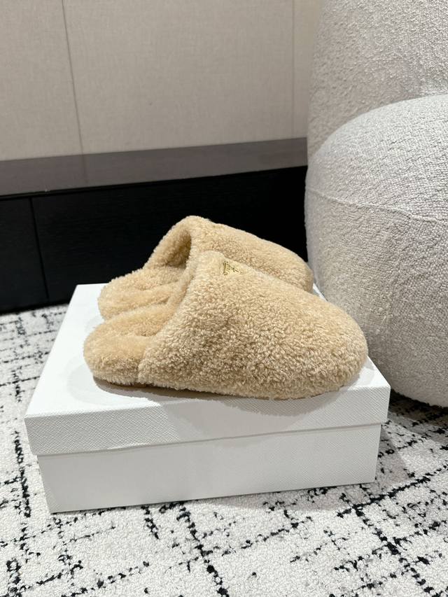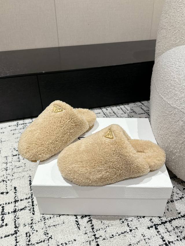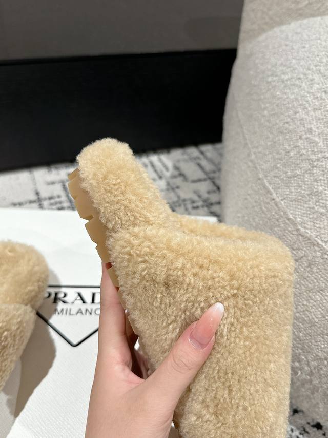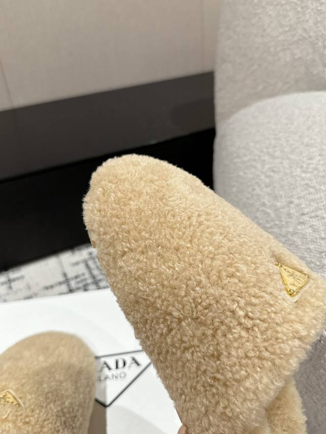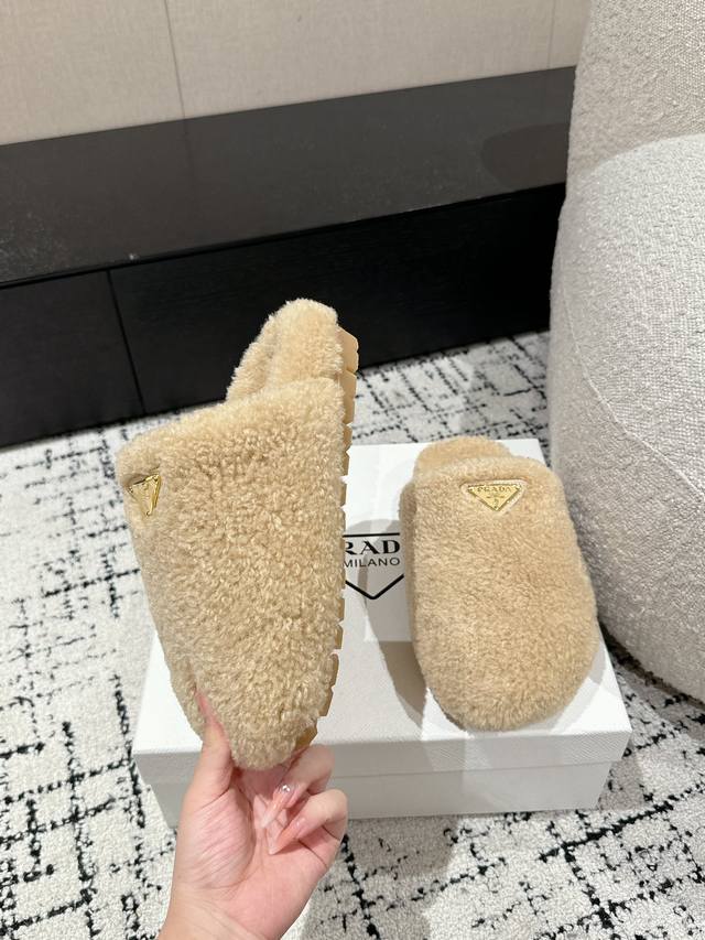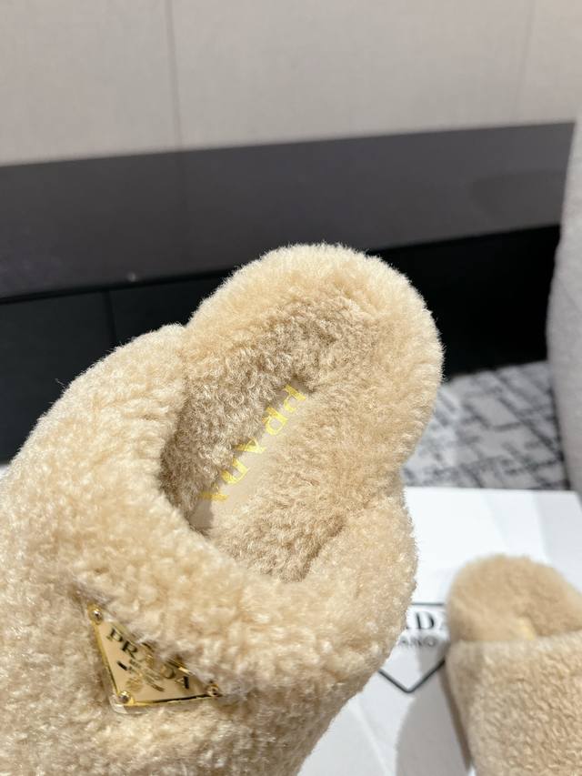 批 prada 普拉达 新品三角标秋冬厚底穆勒包头毛毛拖鞋 材质与工艺: 进口羊京面 原版定制进口羊皮毛一体 170%真羊毛 保暖神器...