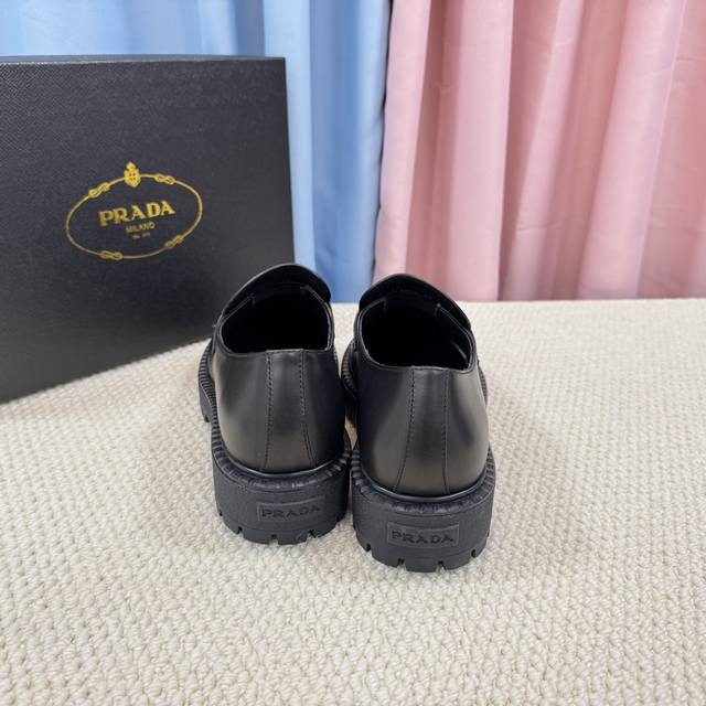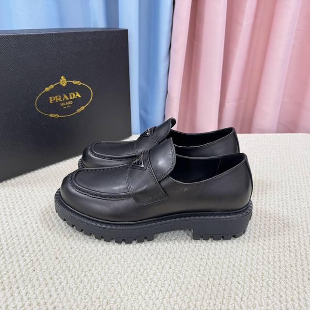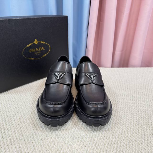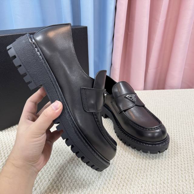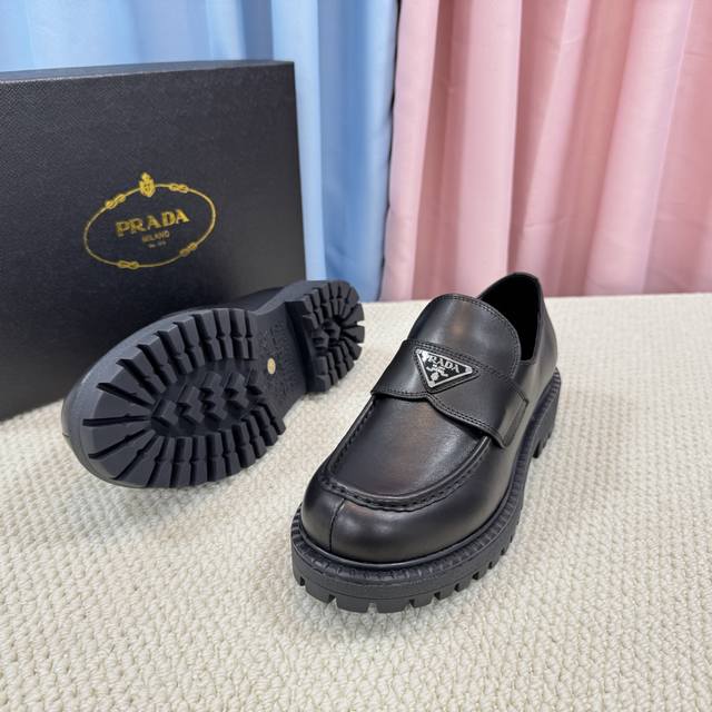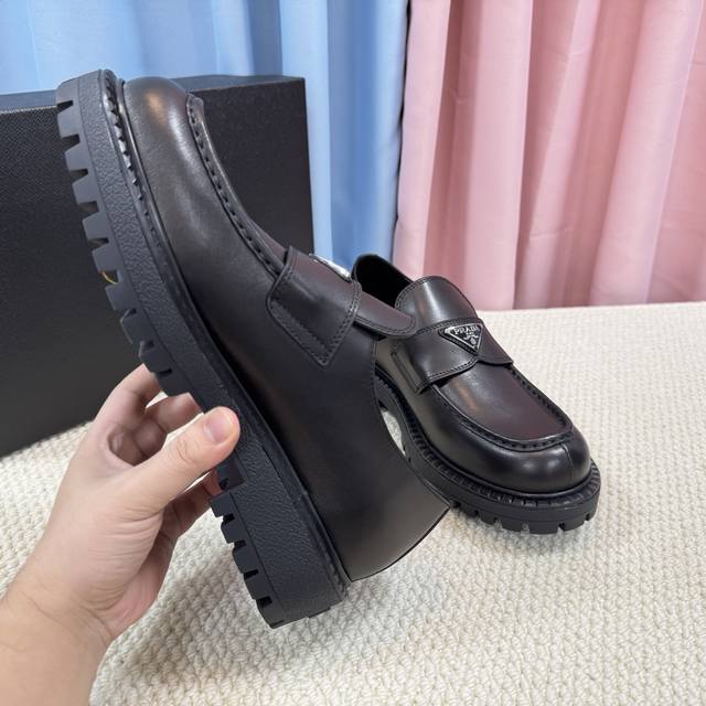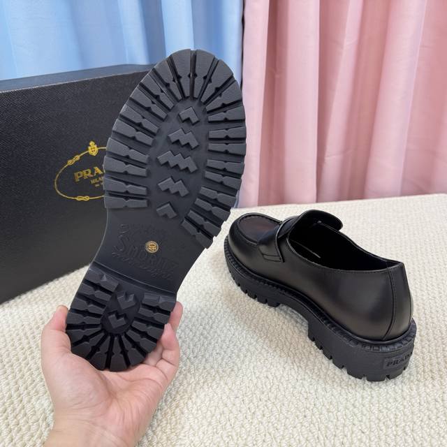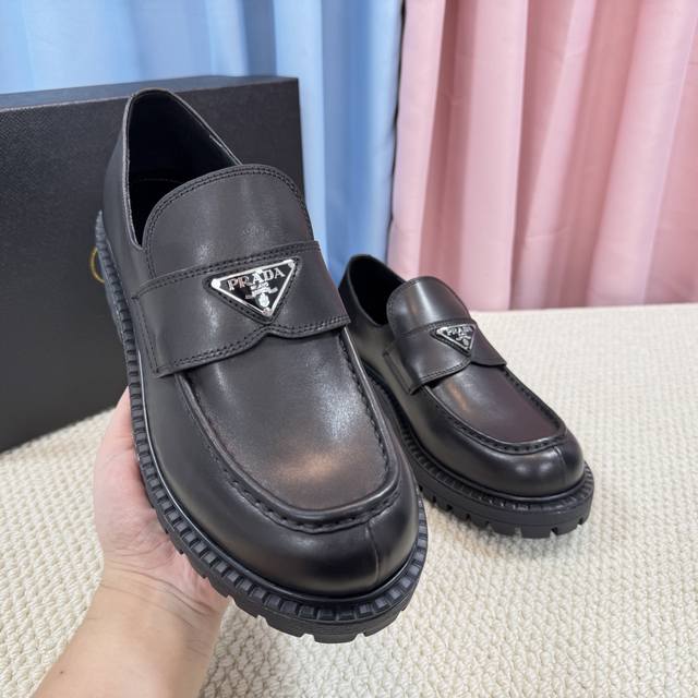 / 顶级版本 经典男款prada普拉达三角扣乐福鞋、简约的隔板设计、搭配极度辨识度的Logo、品牌效应非常扎眼百搭不过时的版面、鞋面开边珠材料、非常有质感、上脚非常