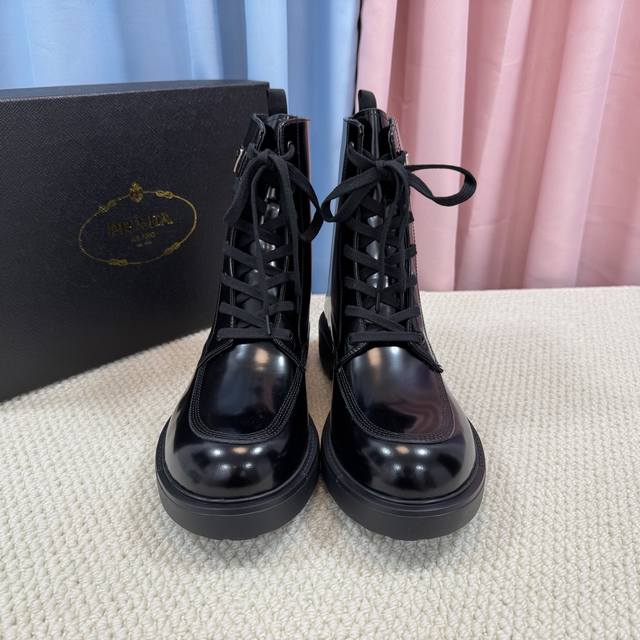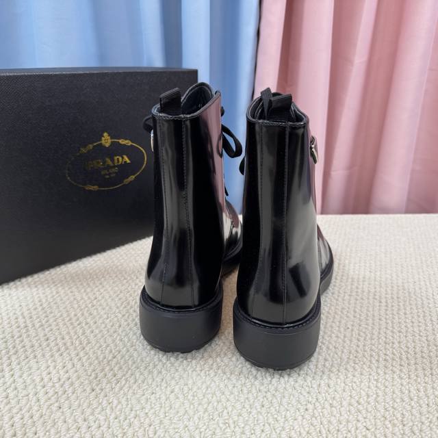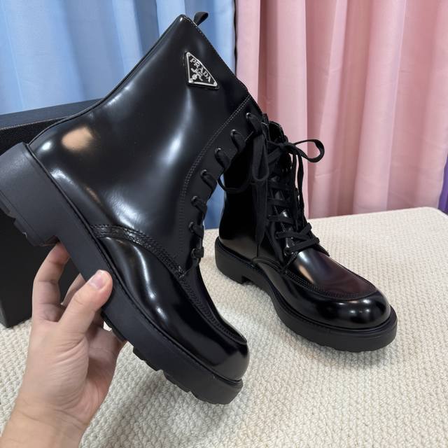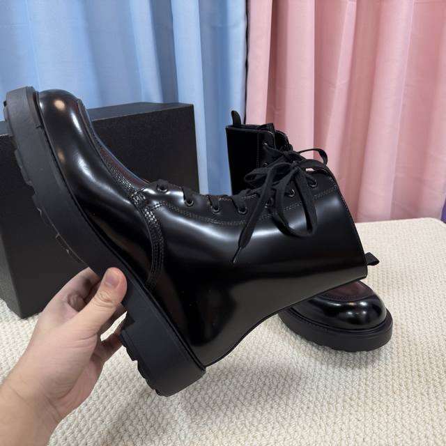 顶级版本 经典男款prada普拉达三角扣短靴、简约的隔板设计、搭配极度辨识度的Logo、品牌效应非常扎眼百搭不过时的版面、鞋面开边珠材料、非常有质感、上脚非常完