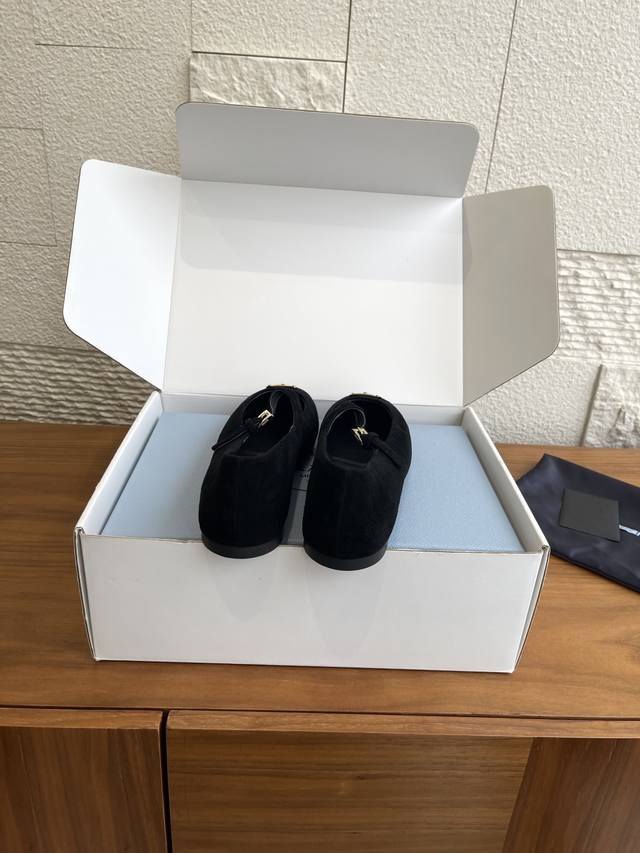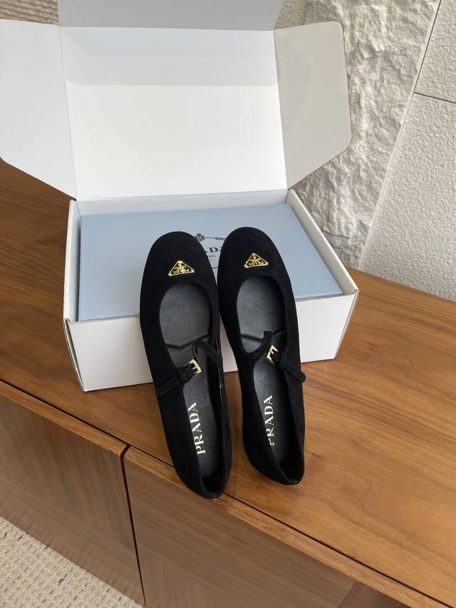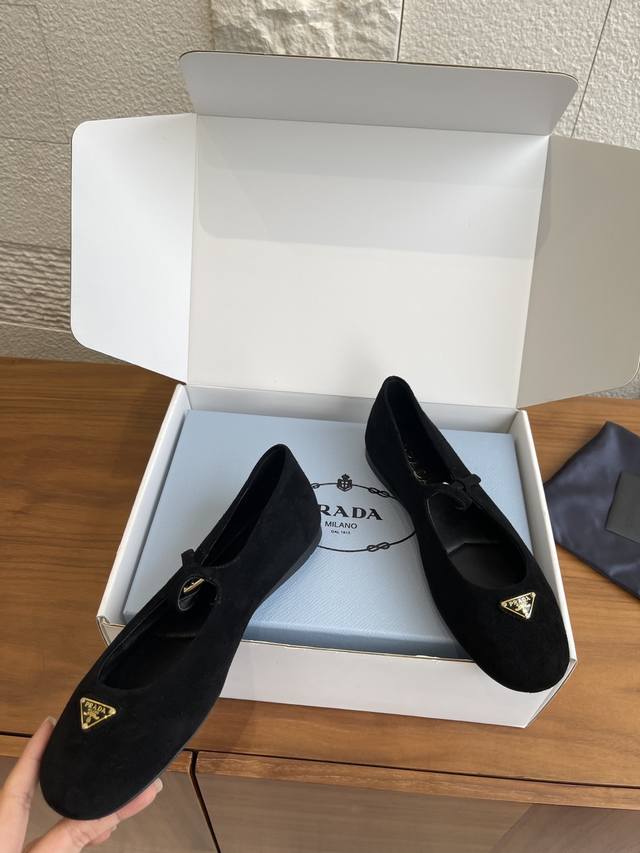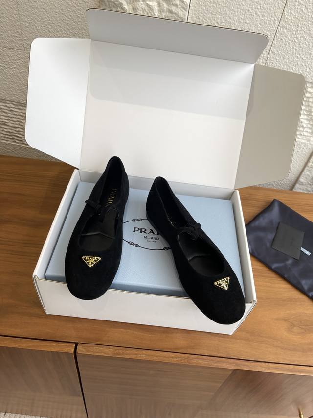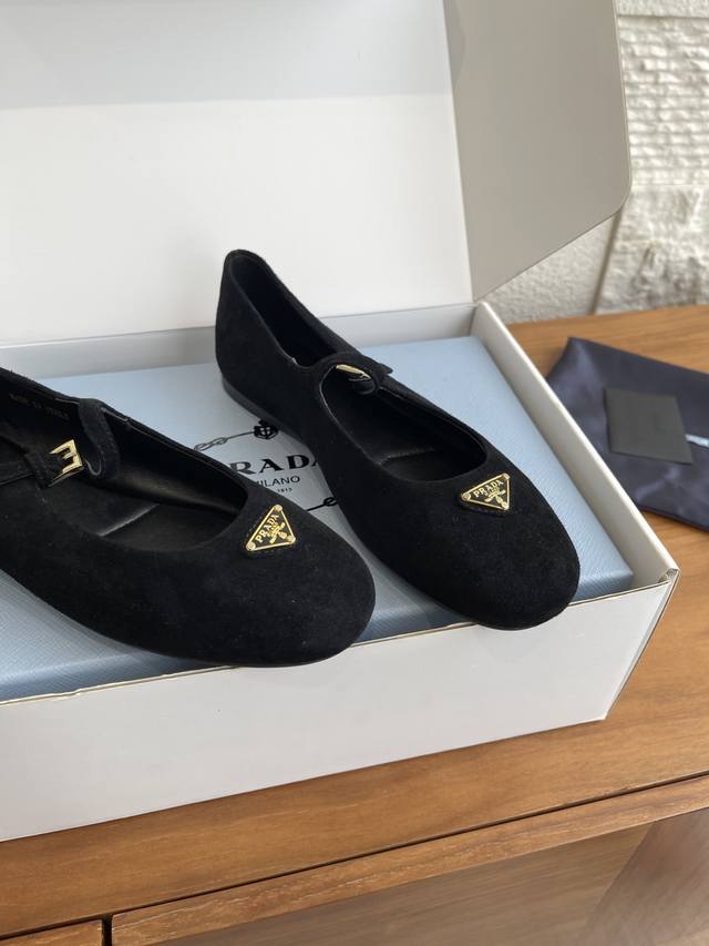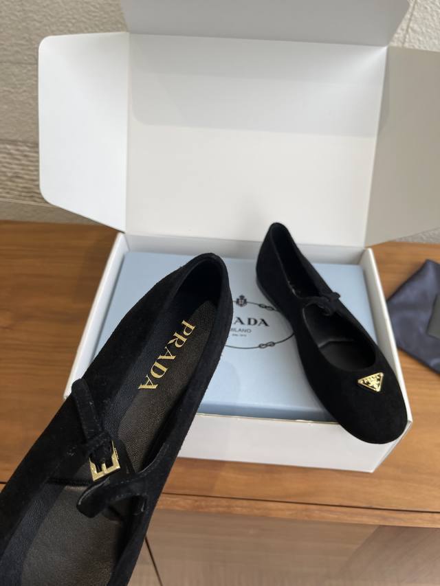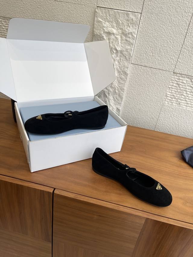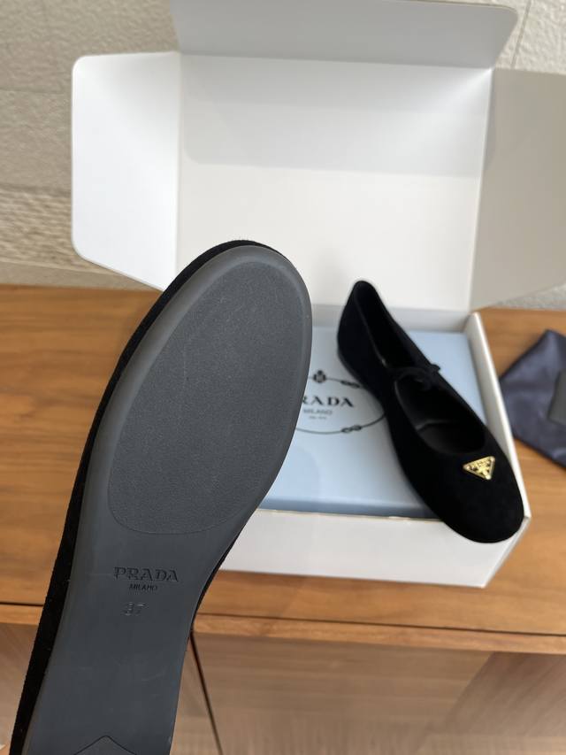 顶级版本: 配送专柜精美盒 Prada 普拉达 25Ss 秋冬新款 圆头 三角扣 绒面 平底 玛丽珍 芭蕾舞鞋 Prada 这款绒面皮革芭蕾平底鞋以锥形轮廓展现