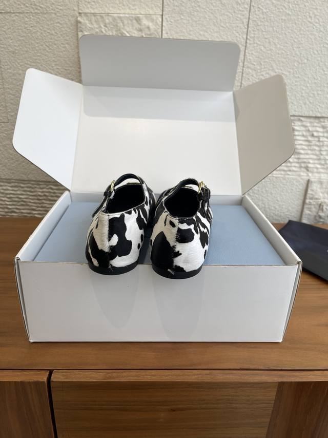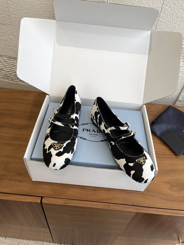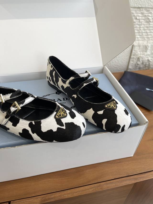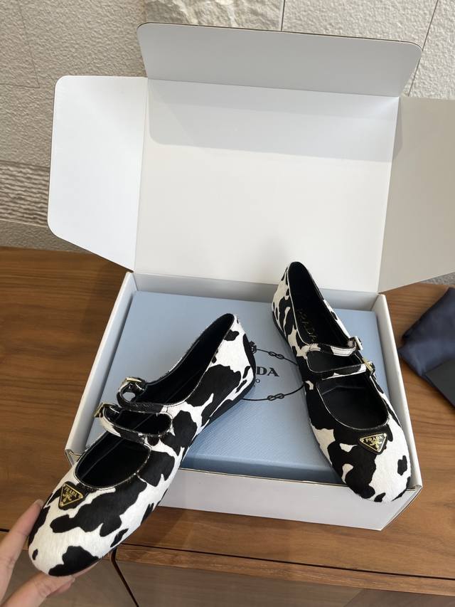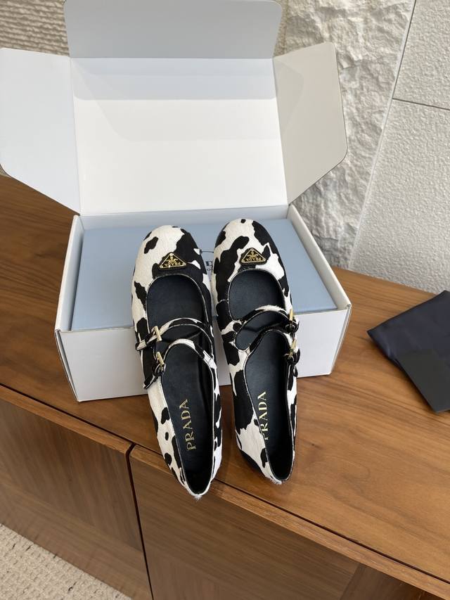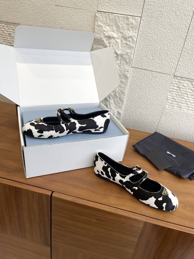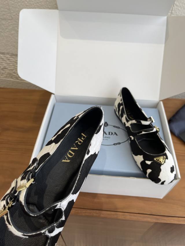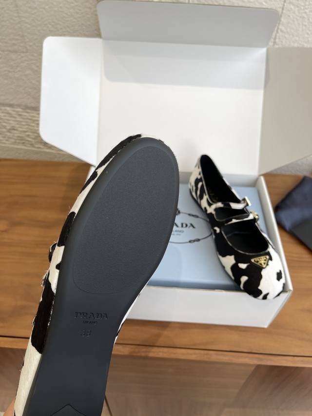顶级版本: 配送专柜精美盒 Prada 普拉达 25Ss 秋冬新款 圆头 双饰腰带 三角扣 平底 玛丽珍 芭蕾舞鞋 Prada 这款皮革芭蕾平底鞋气质优雅柔美,以动物印花灵动点睛。采用圆头设计,搭配双饰带与橡胶鞋底,饰有涂珐琅三角形金属徽标,彰显经典线条和精致优雅细节,平底绝对让脚步轻盈,100%不累脚,上脚稳稳的轻松感。 面料: 进口马毛 内里 垫脚: 进口羊皮 大底: 原版开模橡胶大底 Size: 35-41 40 41定做不退换