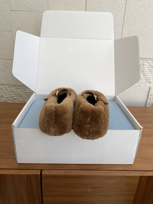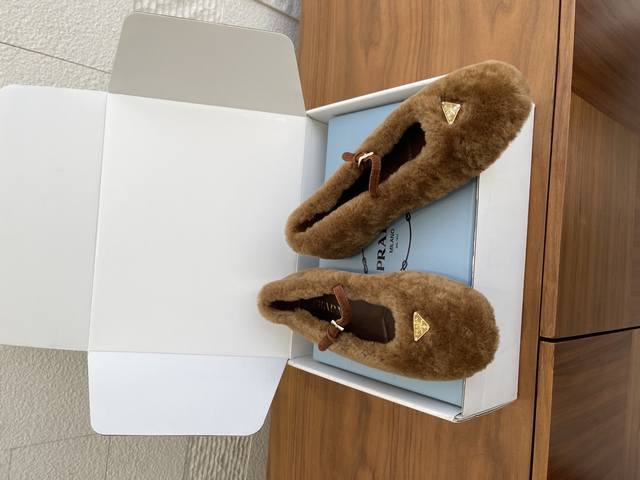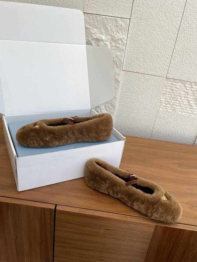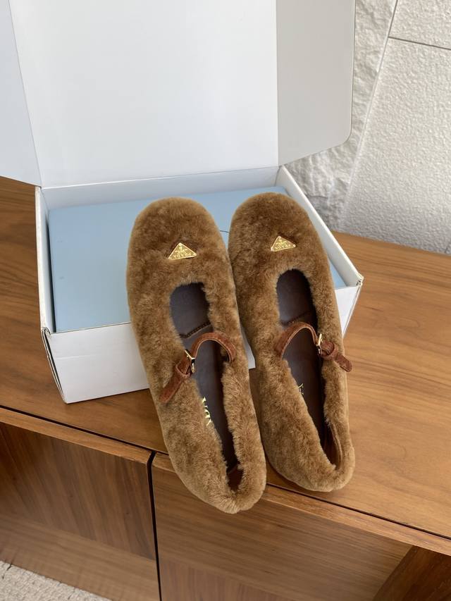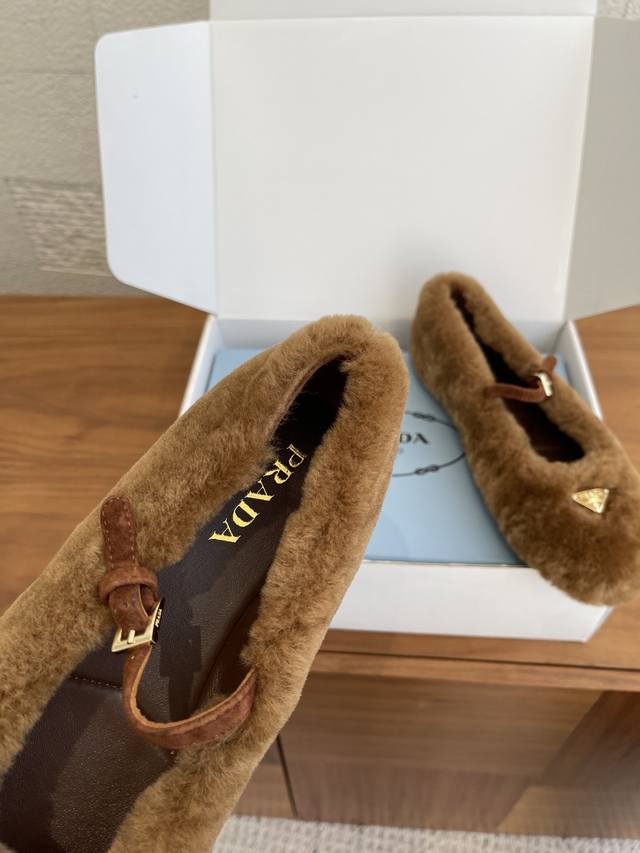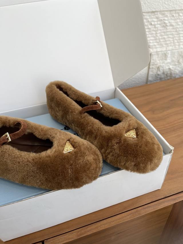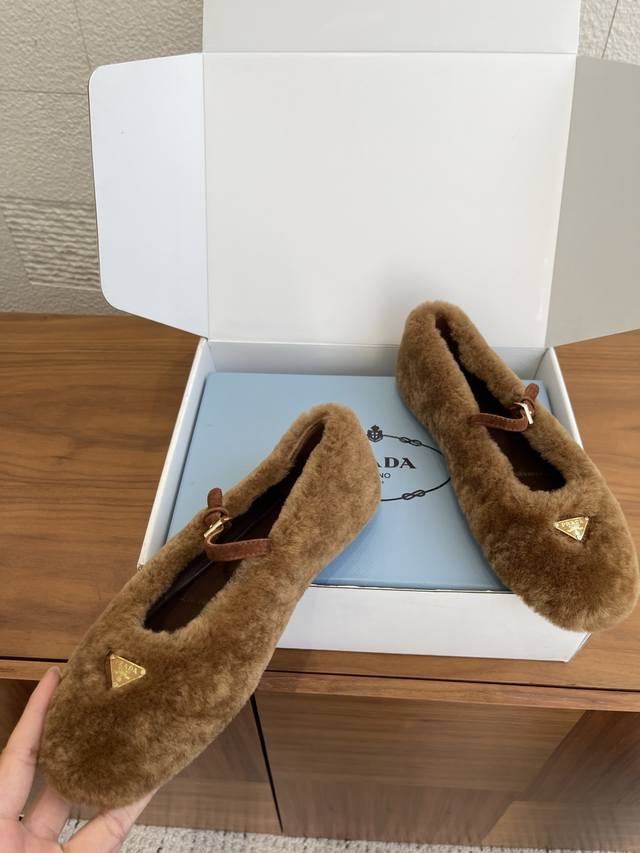 顶级版本: 配送专柜精美盒 Prada 普拉达 25Ss 秋冬新款 羊毛 三角扣 玛丽珍 芭蕾舞鞋 Prada 此款芭蕾舞鞋的设计运用柔和轮廓和冬季质感,重新定