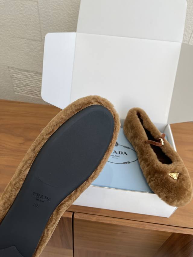 顶级版本: 配送专柜精美盒 Prada 普拉达 25Ss 秋冬新款 羊毛 三角扣 玛丽珍 芭蕾舞鞋 Prada 此款芭蕾舞鞋的设计运用柔和轮廓和冬季质感,重新定义女性化鞋履的经典风格。饰以涂珐琅三角形金属徽标。经典线条与精致细节定义圆头鞋履,采用圆头设计,搭配橡胶鞋底,彰显经典线条和精致优雅细节。 面料: 进口澳洲羊毛 内里 垫脚: 进口羊皮 大底: 原版开模橡胶大底 Size: 35-41 40 41定做不退换