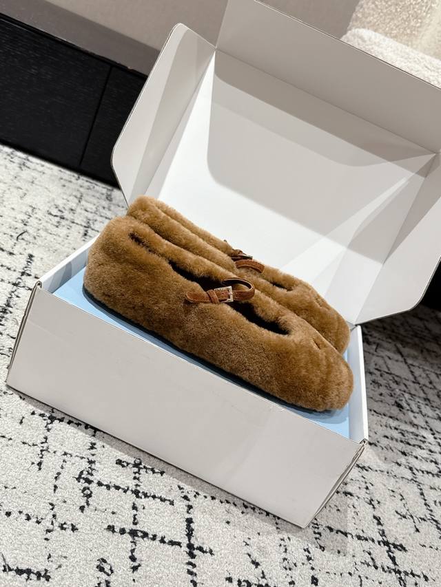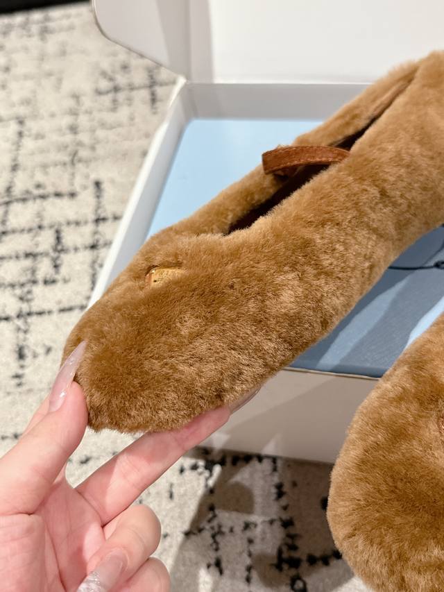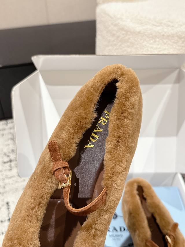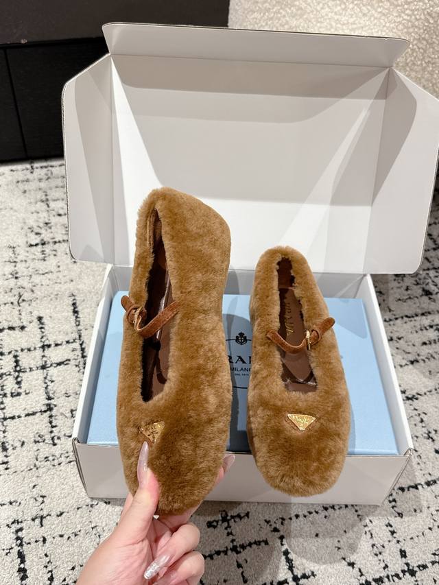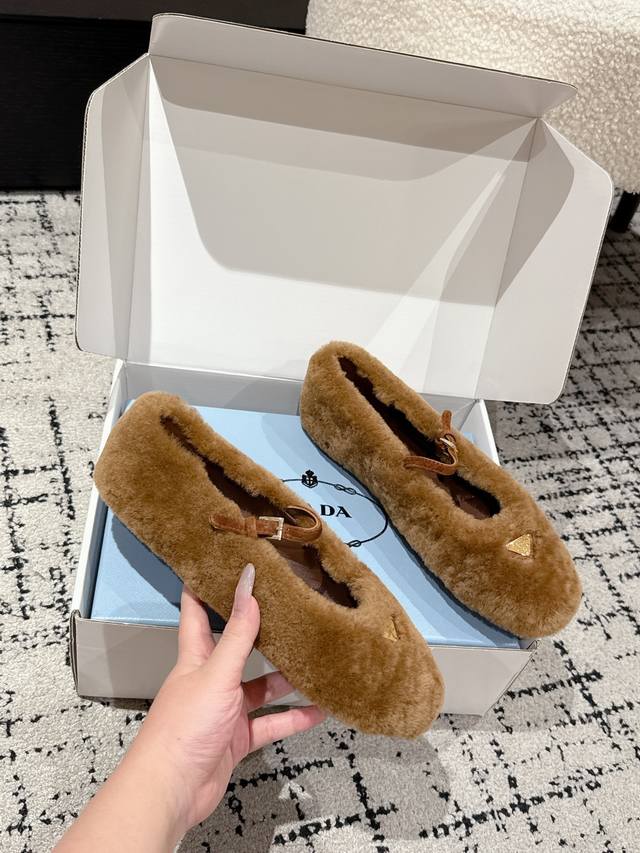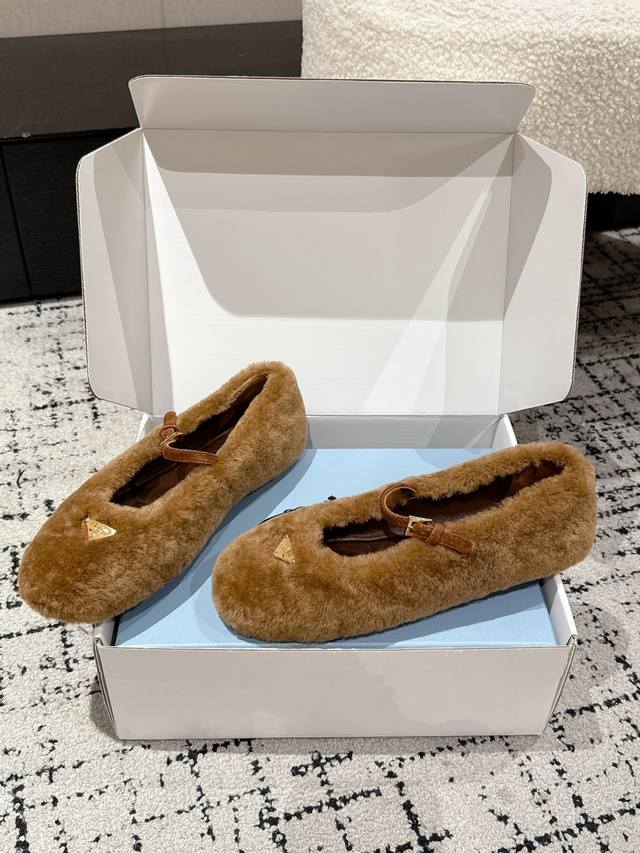 顶级版本 Prada普拉达 25 秋冬 三角标芭蕾舞鞋平底鞋玛丽珍 毛鞋 这款Nappa羊毛面包芭蕾平底鞋以锥形轮廓展现出优雅魅力。采用圆头设计,经典线条搭配雅
