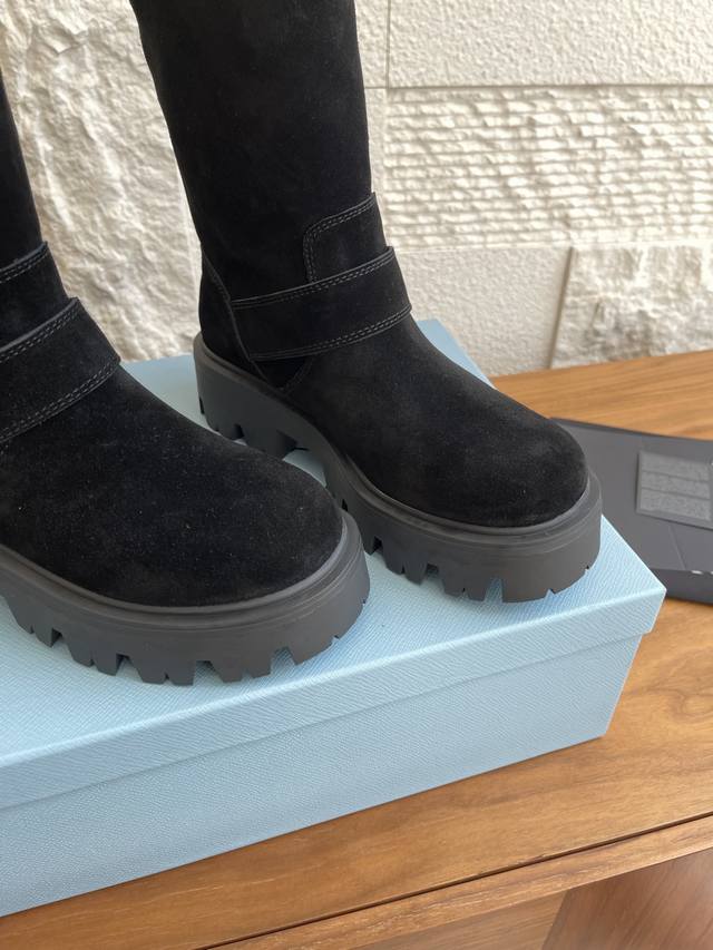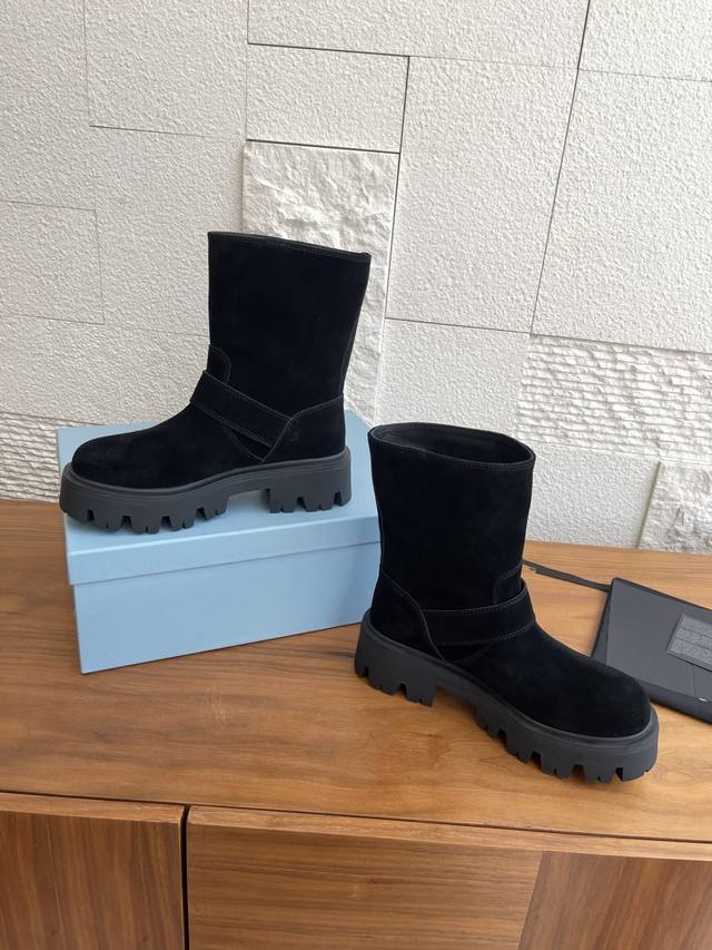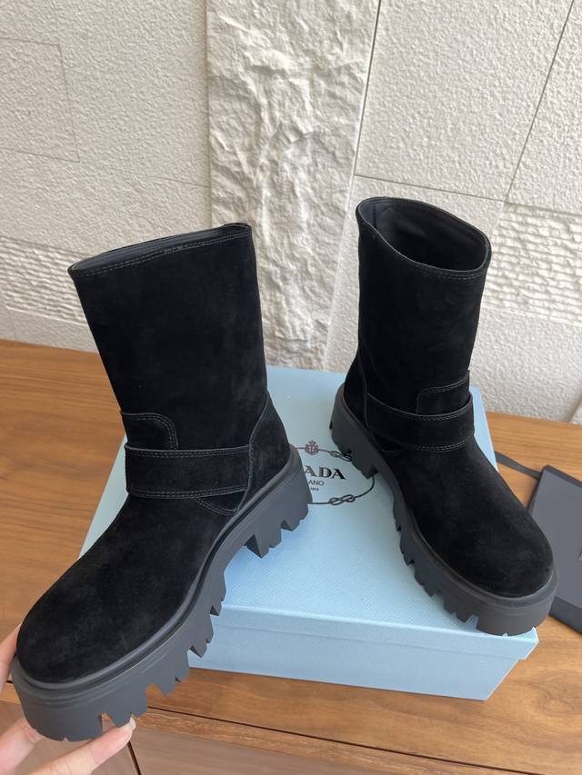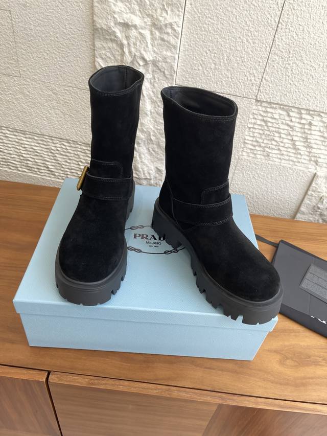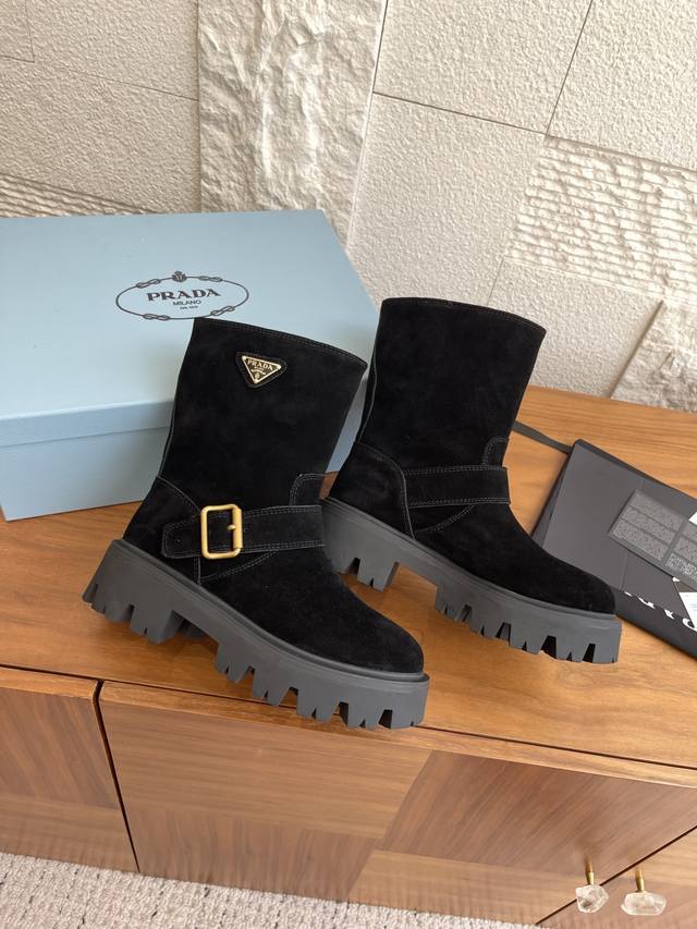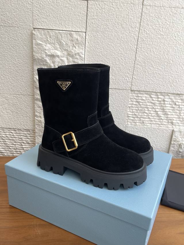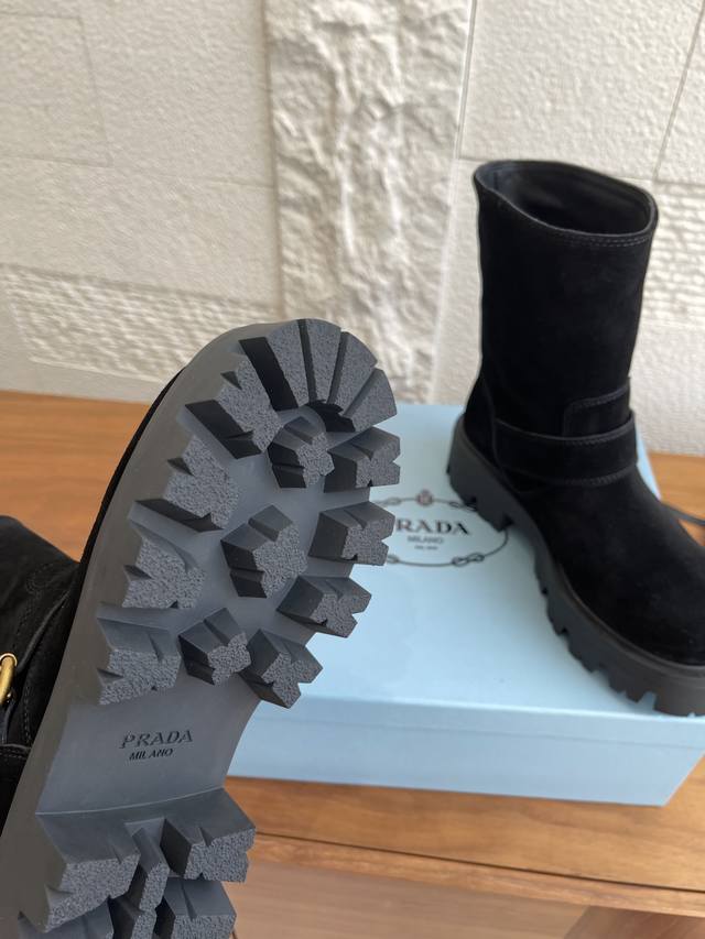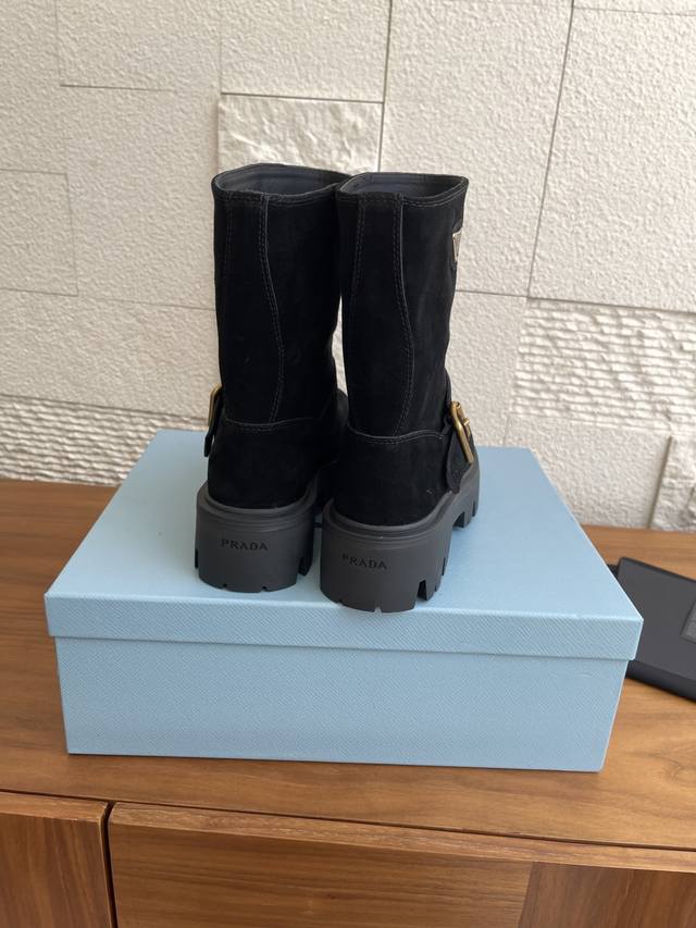 顶级版本: Prada 普拉达 25Ss 秋冬新款 一脚蹬 机车靴 马丁靴 短靴 Prada这款短靴绝对是今年的大爆款,精致线条与工艺构造定义此款绒面短靴,饰有标志性涂珐琅金属三角形徽标。独特的金属搭扣为机车风格增添个性,搭配厚实橡胶鞋底。上脚大气显脚瘦,穿着舒适,百搭神款 面料:进口牛反绒 内里:进口水染羊皮 大底:原版开模橡胶大底 Size:35-41 40 41定做不退换