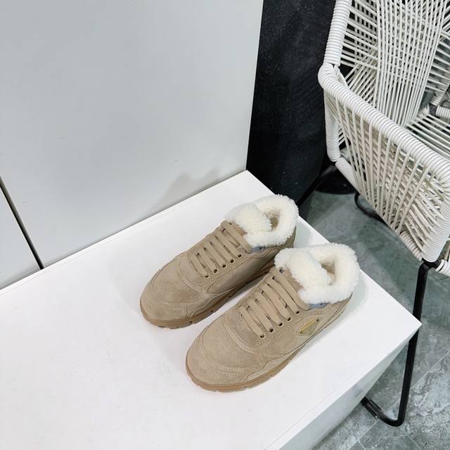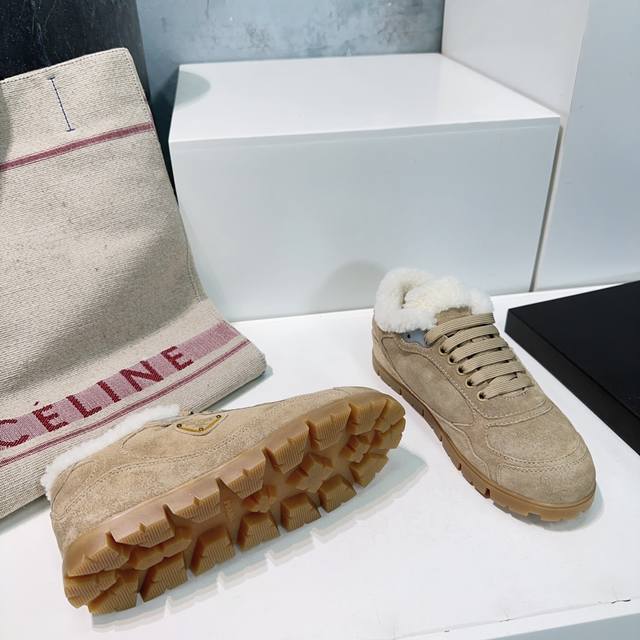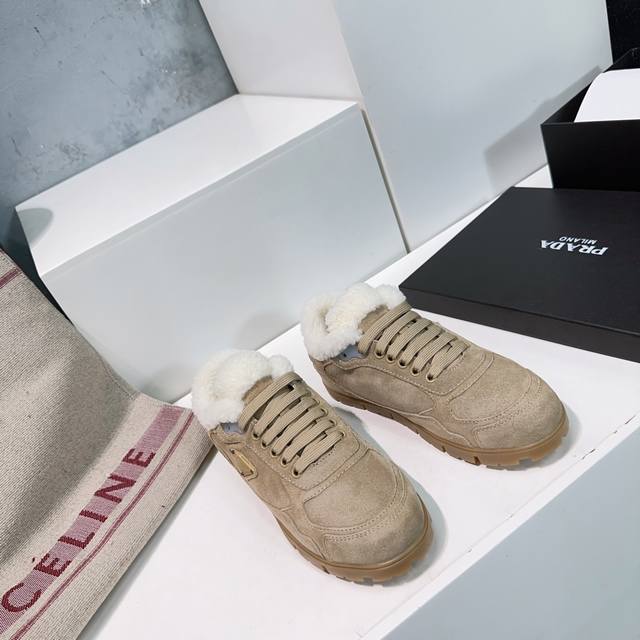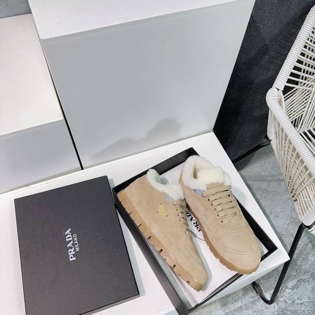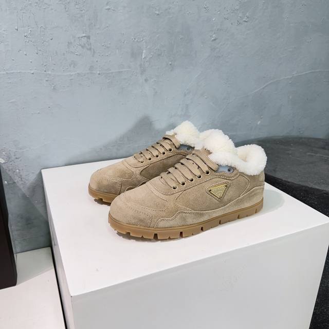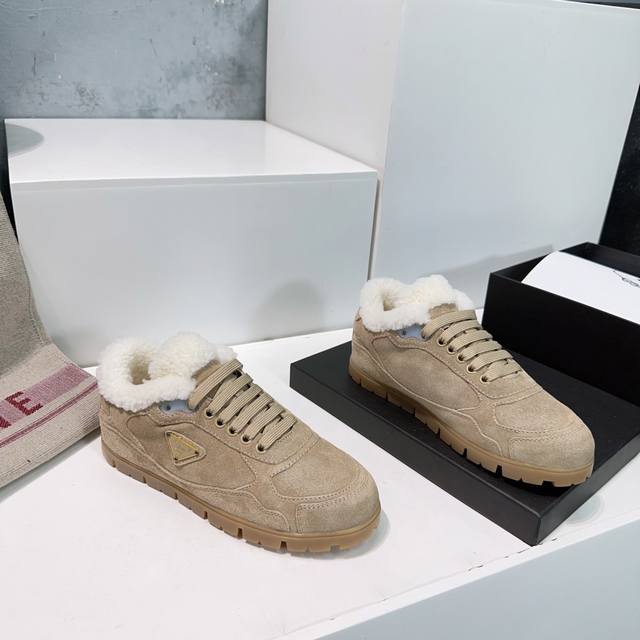 高品质出厂 !顶级品质普拉达 Prada 2025Ss秋冬新款休闲毛毛鞋 阿甘鞋 德训鞋!反绒皮面 超帅 复古时尚 复古擦色 经典三角扣搭配 高级气质 随意搭配 上脚非常轻便舒适,保证进口羊毛里,保暖又百搭! 鞋面采用原版牛反绒 内里垫脚进口保证羊羔毛 原版开模橡胶防滑大底 码数:35-40 40定做不退换 配原版包装