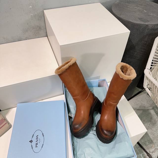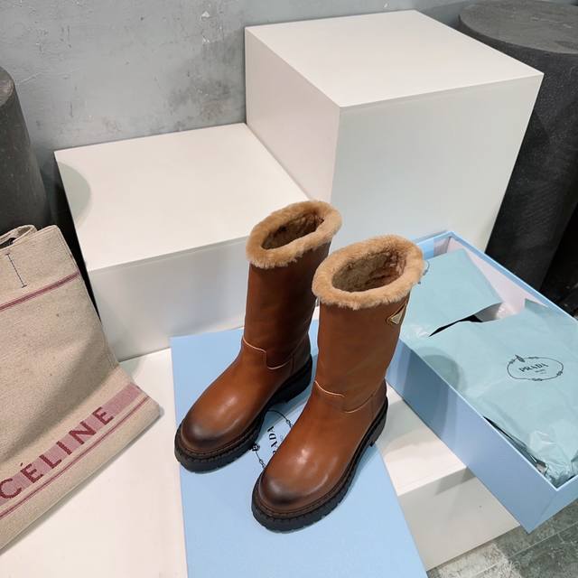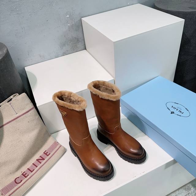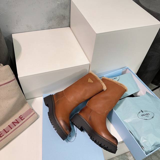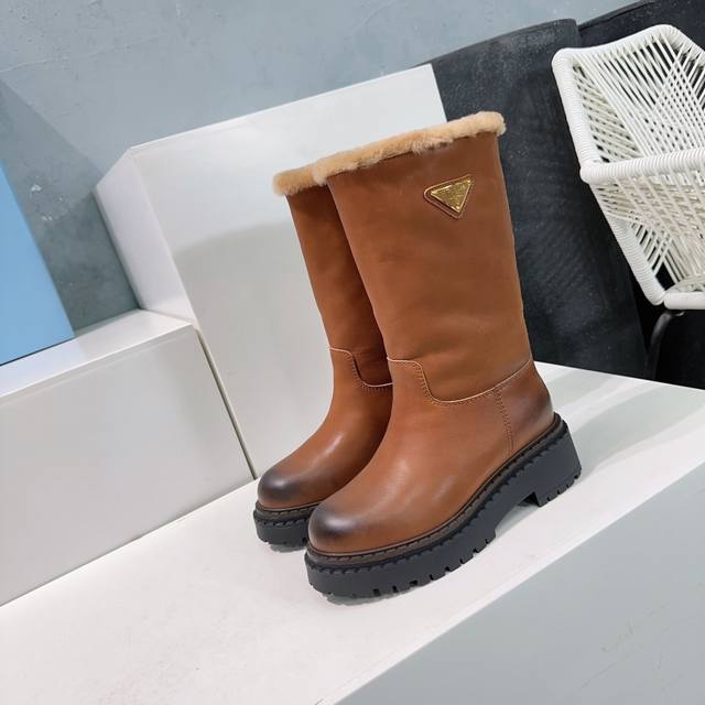高品质出厂 !顶级品质Prada普拉达 25Ss秋冬经典三角标松糕厚底羊毛雪地靴一脚蹬长筒靴! 时尚厚底休闲长靴 ,独到味道,人人都爱也轻松驾驭 ,还有就是百搭