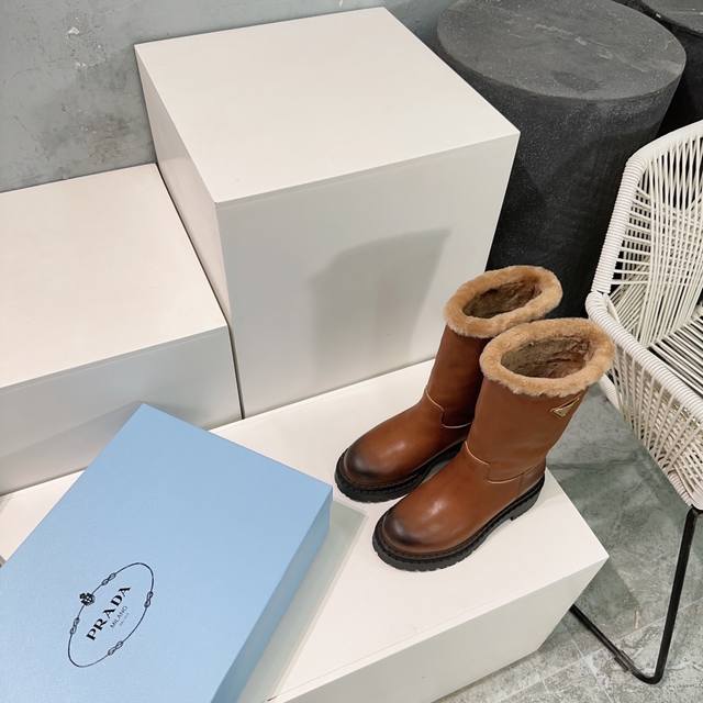 高品质出厂 !顶级品质Prada普拉达 25Ss秋冬经典三角标松糕厚底羊毛雪地靴一脚蹬长筒靴! 时尚厚底休闲长靴 ,独到味道,人人都爱也轻松驾驭 ,还有就是百搭经典的鞋楦,足以征服你,穿上它,秋冬保暖搭配两不失误,上脚简单帅气! 鞋面采用头层牛皮 内里垫脚进口羊毛 原版开模 Tpu橡胶防滑大底 底厚:4.5Cm 码数:36-40 40定做不退换 配原版包装