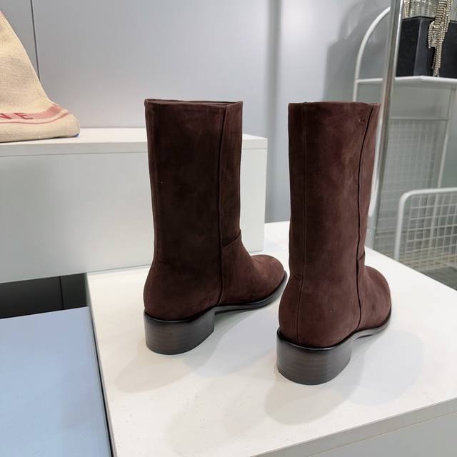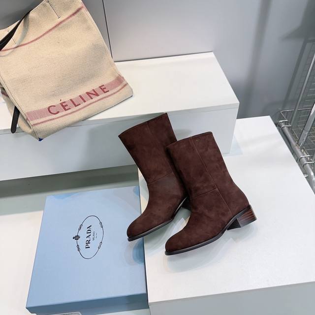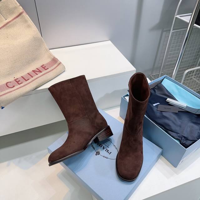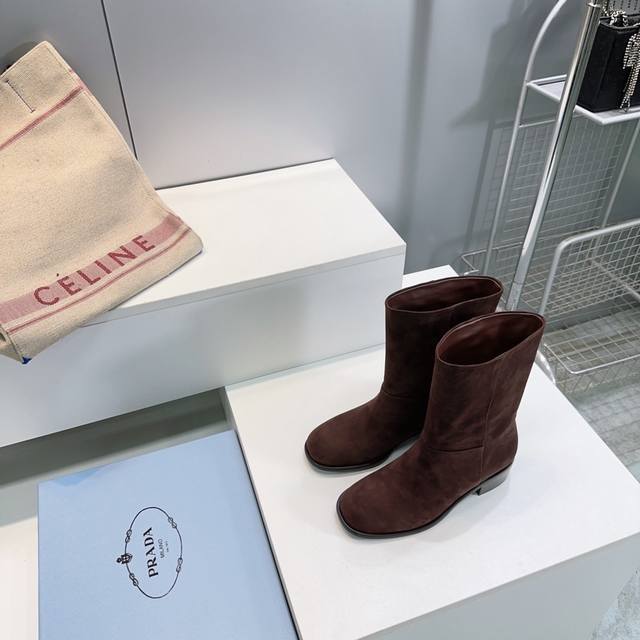 高品质出厂 !顶级品质Prada普拉达 25Ss 秋冬新品直筒一脚蹬粗跟圆头短靴! 极简百搭!独到味道,人人都爱也轻松驾驭 ,穿上它增高休闲两不失误,上脚简单帅