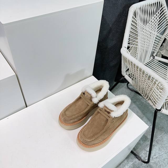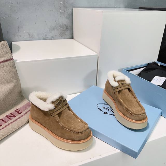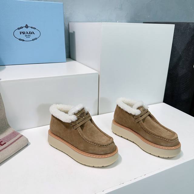 高品质出厂 !顶级品质Prada普拉达2025Ss秋冬最新厚底保暖毛毛短靴雪地靴!圆头三角扣毛毛鞋! 网红爆款,官网同步最新款,顶级品质,毛茸茸的时髦感十足,舒适的圆头设计,不挑脚型驾驭的同时,越看越有味道 上脚也会更显优雅气质更衬比例,冬天实穿性和搭配率都蛮高!内里纯羊羔毛材质,蓬松密卷,敦厚饱满,保暖又百搭! 鞋面采用原版牛反绒 内里垫脚进口保证羊羔毛 原版开模防滑橡胶大底 底厚:约4.5Cm 码数:35-40 40订做不退换 配原版包装
