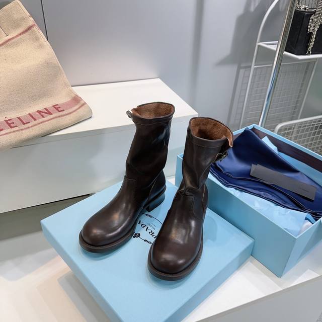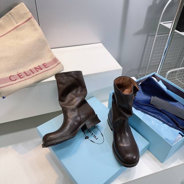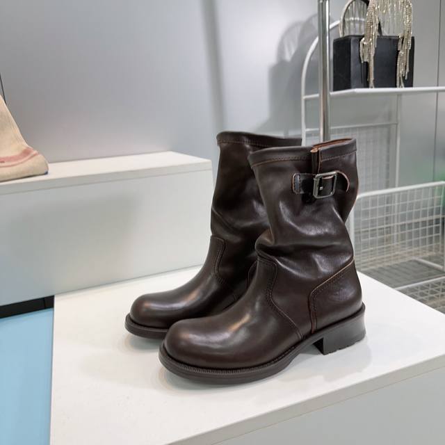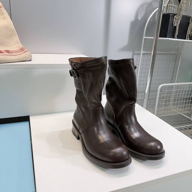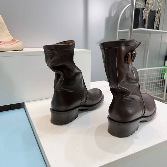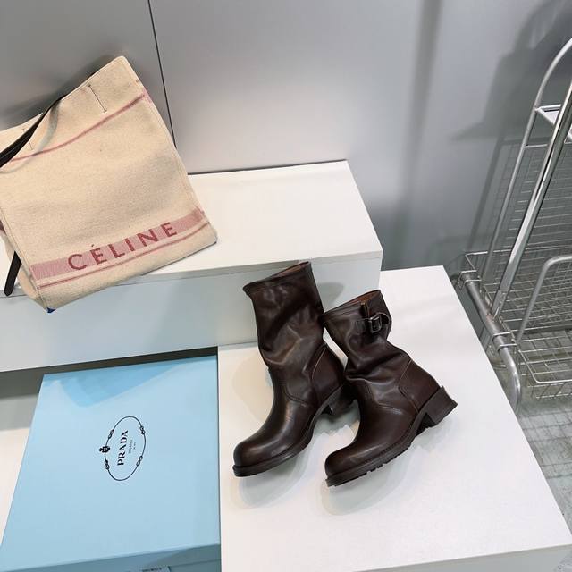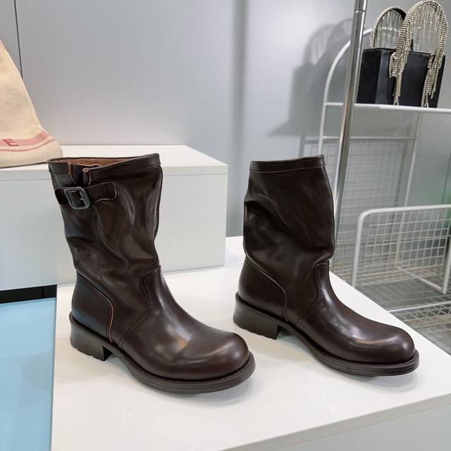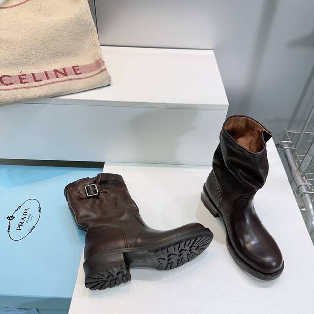 高品质出厂 !顶级品质Prada 普拉达25Ss秋冬新品宽筒皱面皮带扣复古一脚蹬中筒短靴! 经典的皮带扣设计 如同一把时光钥匙!打开复古与摩登交融的大门。 金属扣的光泽与皮革的质感相互映衬,每一道纹理、每一次扣合 都诉说着P家对精湛工艺的执着追求。 靴子的轮廓 巧妙融合了往昔的优雅与当下的个性。 做旧效果的皮革 带着岁月的痕迹 仿佛在讲述着时尚的故事 而简洁利落的线条 则赋予其现代感的利落身姿 让每一步都散发着独特的魅力。 无论是搭配复古风的连衣裙 还是率性的牛仔裤 都能成为点睛之笔 让你在时尚的舞台上