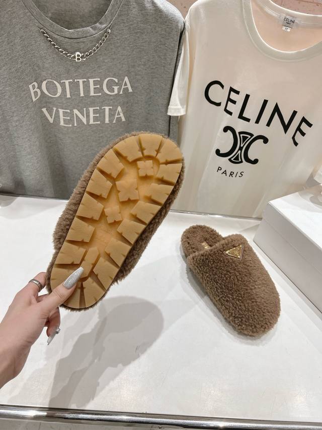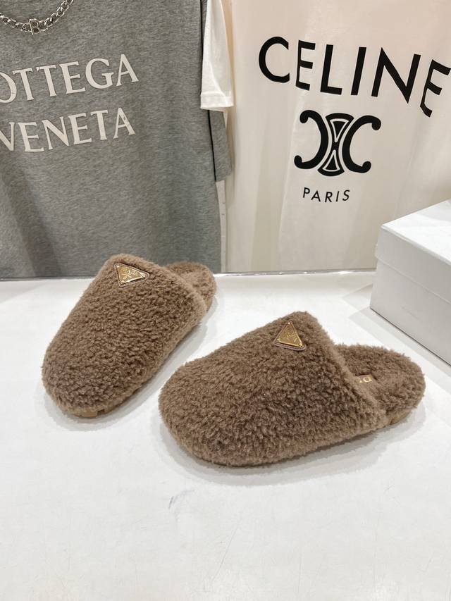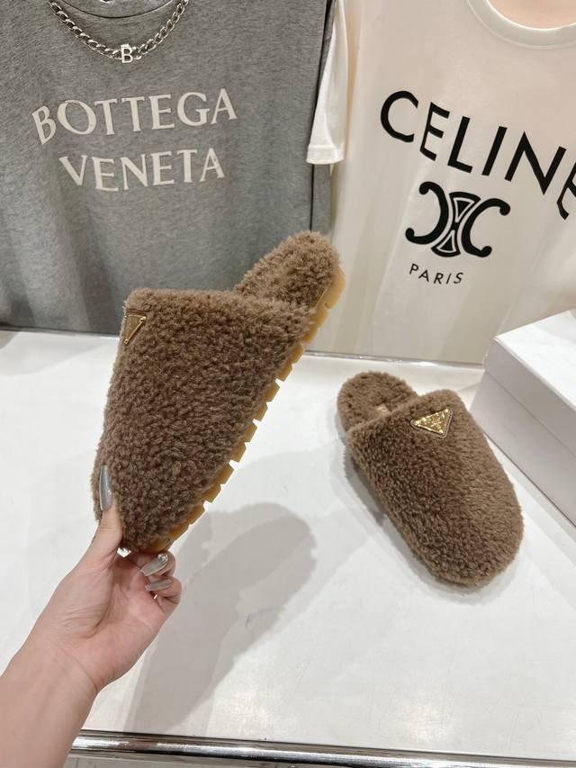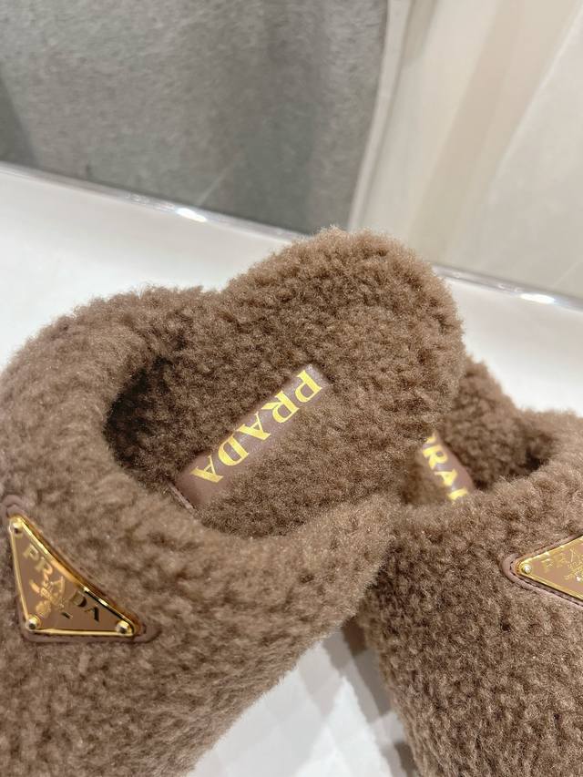 高版本出厂 Prada*普拉达F029 2025Ss秋冬新款居家半包羊毛拖鞋毛毛鞋闪亮登场 时尚大方的设计呈现经典轮廓。不管面对任何场所 主场只属于你! 面料:进口羊卷毛 内里:进口羊卷毛 五金:原版五金1:1开模 大底:原版开模生胶大底 码数:35-39 40 41 订做不退换