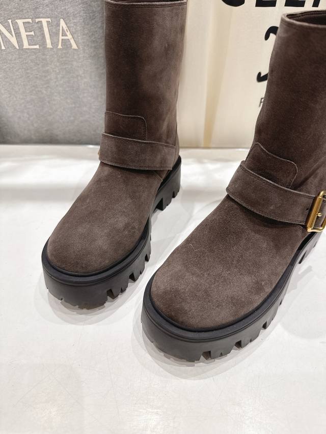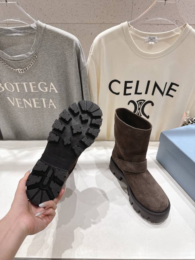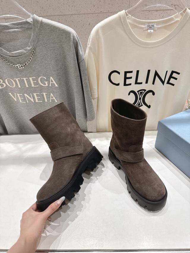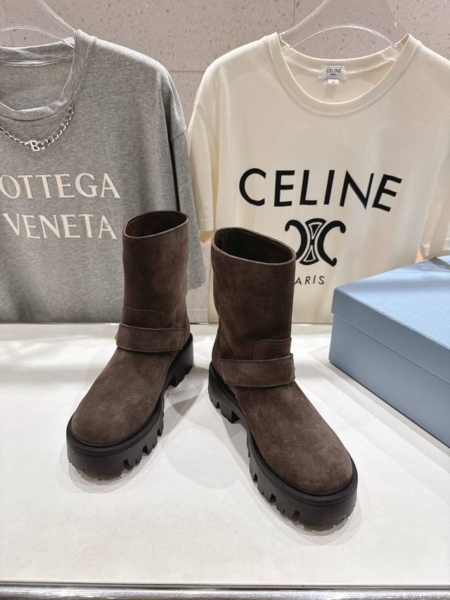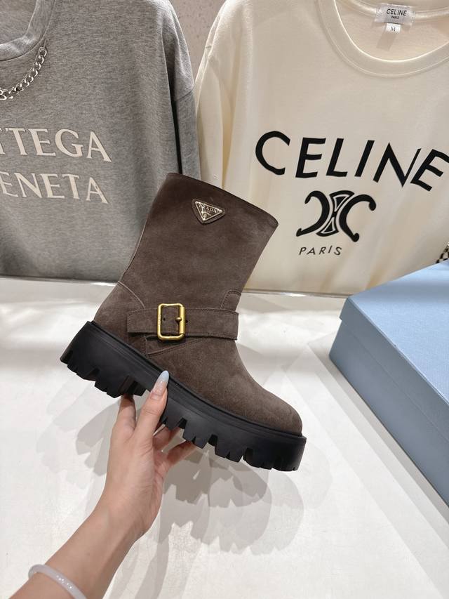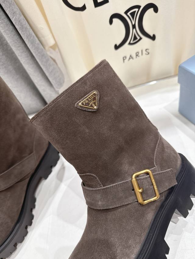 高版本出厂 Prada 普拉达F034 2025Ss最新三角扣厚底中筒靴马丁靴,非常耐看的一款 走秀款中筒靴 原版复刻 版型超正 超经典百搭款 超级耐看 耐穿 不过时 瘦腿神器 简约大气 鞋面:进口高丝光牛反绒 内里:丝绸牛皮 大底:原版开模大底 码数:35-40 40.41订做不退换