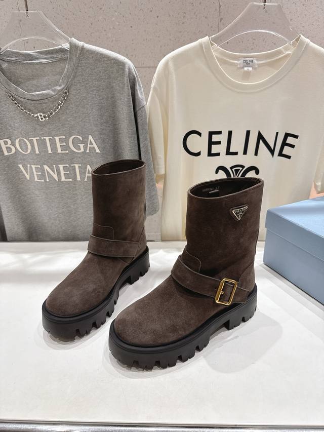 / 高版本出厂 Prada 普拉达F034 2025Ss最新三角扣厚底中筒靴马丁靴,非常耐看的一款 走秀款中筒靴 原版复刻 版型超正 超经典百搭款 超级耐看 耐穿