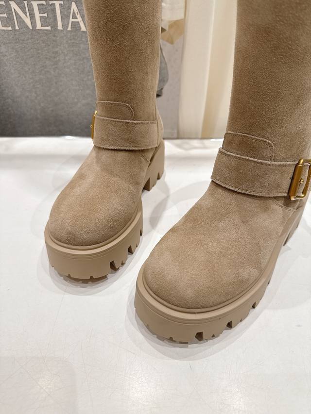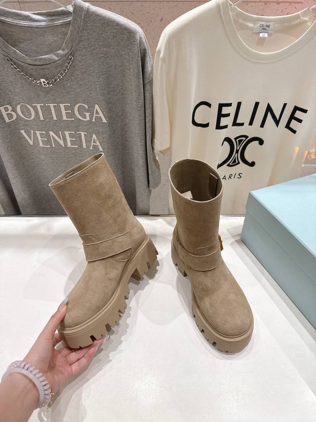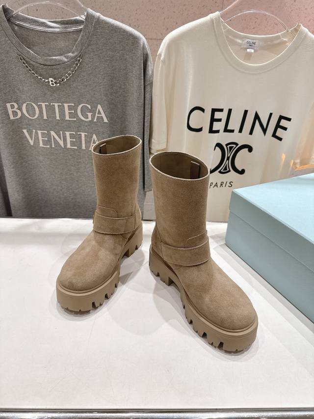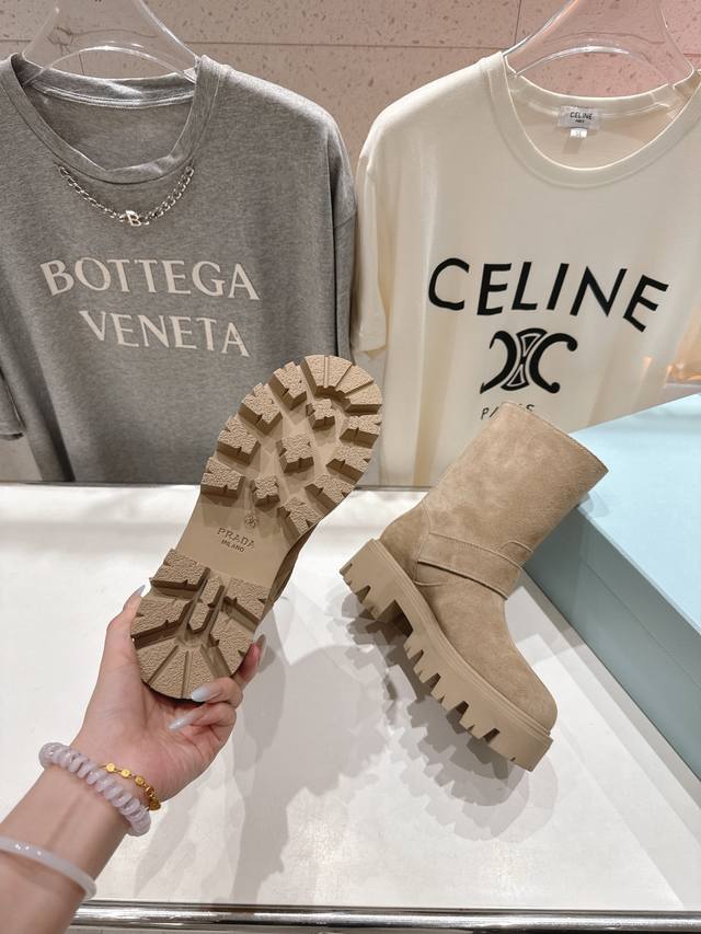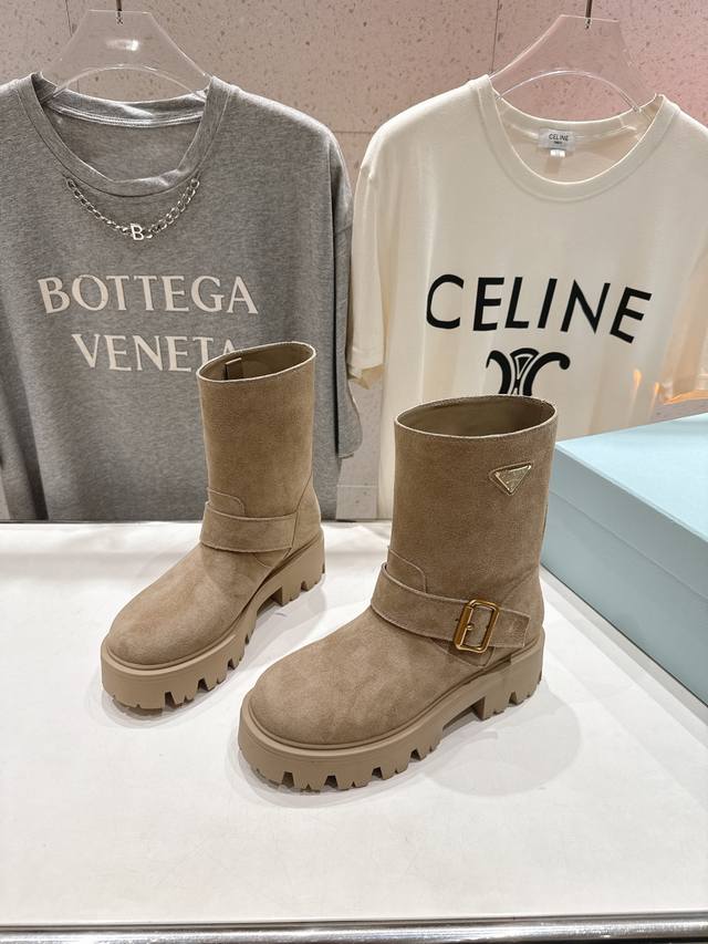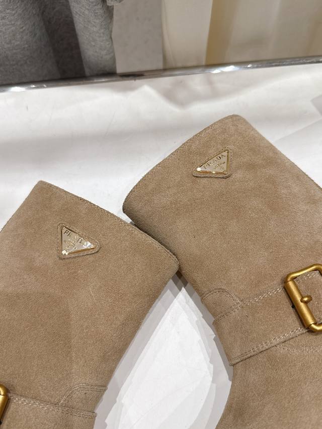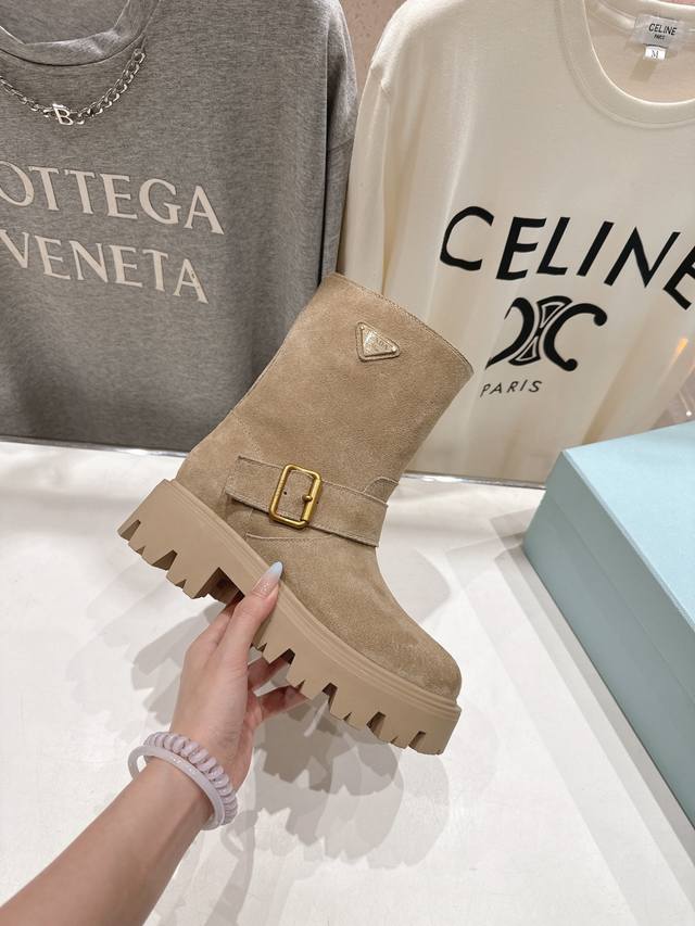 高版本出厂 Prada 普拉达F034 2025Ss最新三角扣厚底中筒靴马丁靴,非常耐看的一款 走秀款中筒靴 原版复刻 版型超正 超经典百搭款 超级耐看 耐穿 不过时 瘦腿神器 简约大气 鞋面:进口高丝光牛反绒 打蜡擦色小牛皮 内里:丝绸牛皮 大底:原版开模大底 码数:35-40 40.41订做不退换