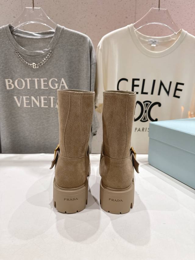 高版本出厂 Prada 普拉达F034 2025Ss最新三角扣厚底中筒靴马丁靴,非常耐看的一款 走秀款中筒靴 原版复刻 版型超正 超经典百搭款 超级耐看 耐穿