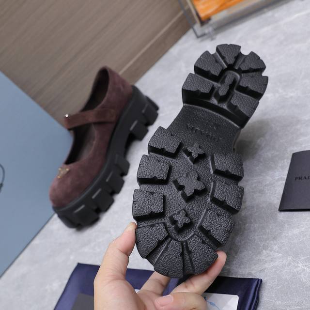 高版本 Prad* 普拉达25Ss新款厚底玛丽珍单鞋 复古时髦前卫的轮齿厚底鞋底搭配牛皮鞋面让整双鞋轻便舒适 鲜艳色彩 满足不同风格时髦人士的多种选择!标志性Logo印花搭配古沙滩凉鞋造型,每一个设计元素都踩在时髦点上!让整双鞋轻便舒适 鲜艳色彩 满足不同风格时髦人士的多种选择! 鞋面:开边珠 牛反绒、 内里:牛皮 大底:原版开模大底 Size:35-40 41定制不退换 价格P: