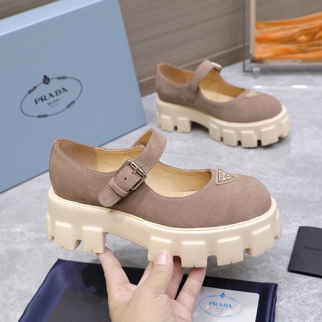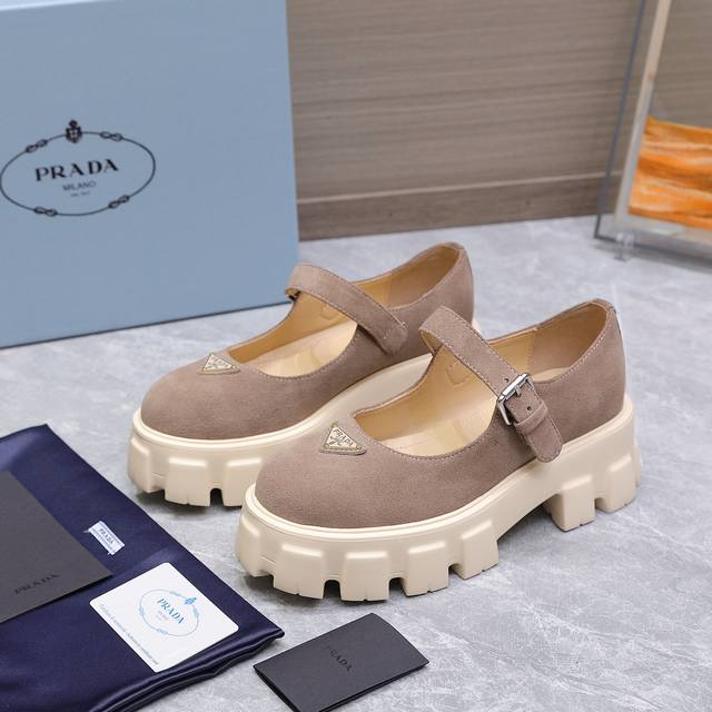 高版本 Prad* 普拉达25Ss新款厚底玛丽珍单鞋 复古时髦前卫的轮齿厚底鞋底搭配牛皮鞋面让整双鞋轻便舒适 鲜艳色彩 满足不同风格时髦人士的多种选择!标志性Logo印花搭配古沙滩凉鞋造型,每一个设计元素都踩在时髦点上!让整双鞋轻便舒适 鲜艳色彩 满足不同风格时髦人士的多种选择! 鞋面:开边珠 牛反绒、 内里:牛皮 大底:原版开模大底 Size:35-40 41定制不退换 价格P: