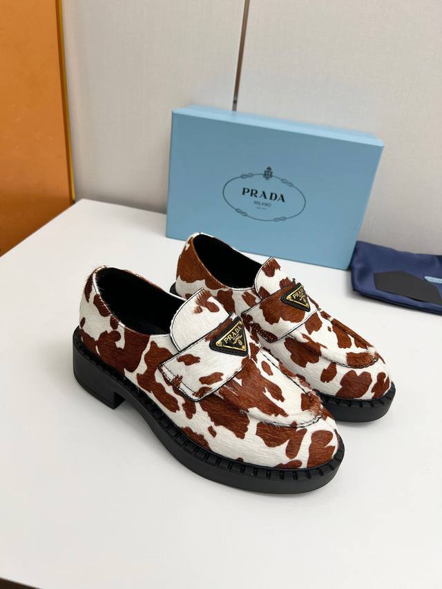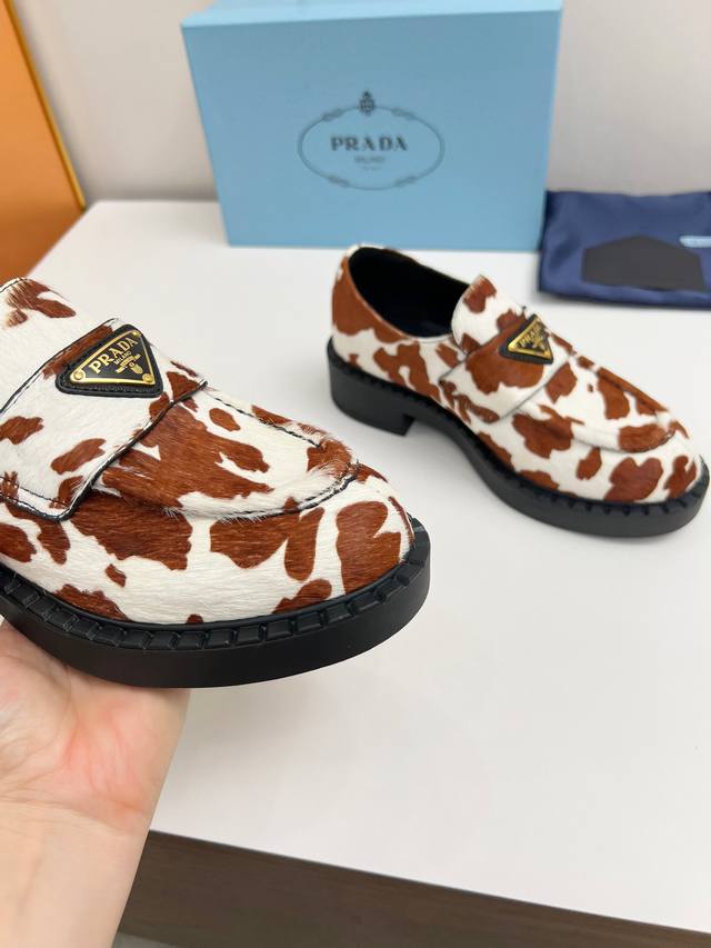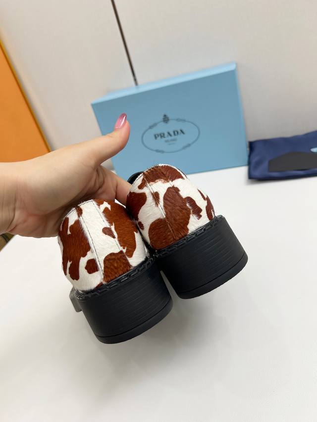 2025普拉达新款奶牛配色乐福鞋 时尚厚底休闲机车乐福鞋 独到味道,人人都爱也轻松驾驭 每年都会爆.还有就是百搭经典的鞋楦足以征服你穿上它增高休闲两不失误 上脚