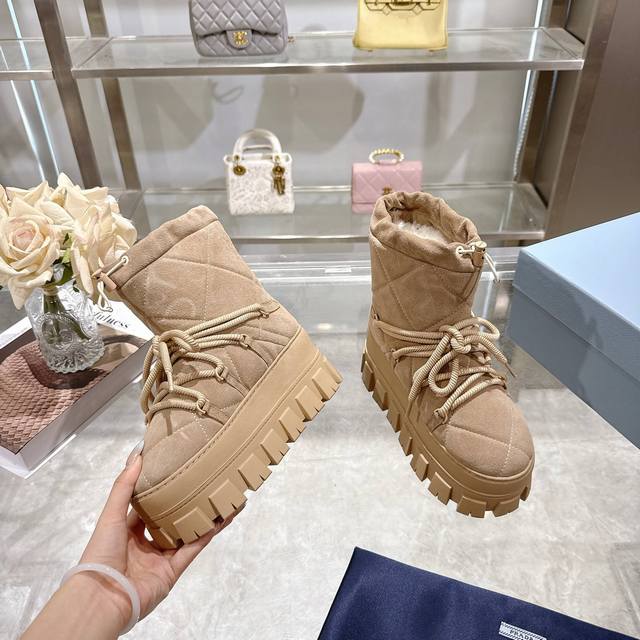 / 2025最新Prada普拉达:新奇别致的柔软牛皮面,纯羊毛里,独特的设计的风格,为此款复古风雪地靴注入心裁别出的设计巧思 4.5厘米橡胶鞋底 涂珐琅金属配件 凹