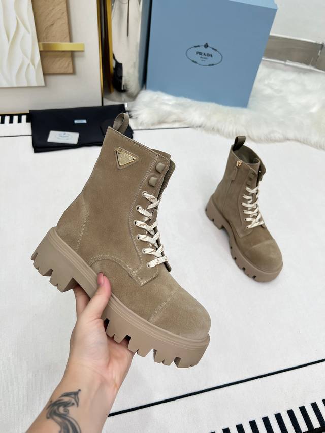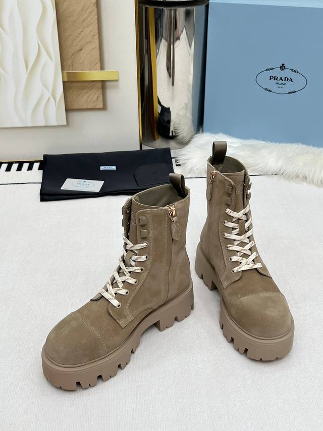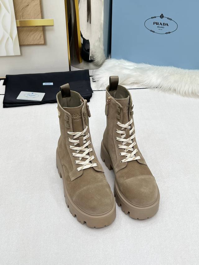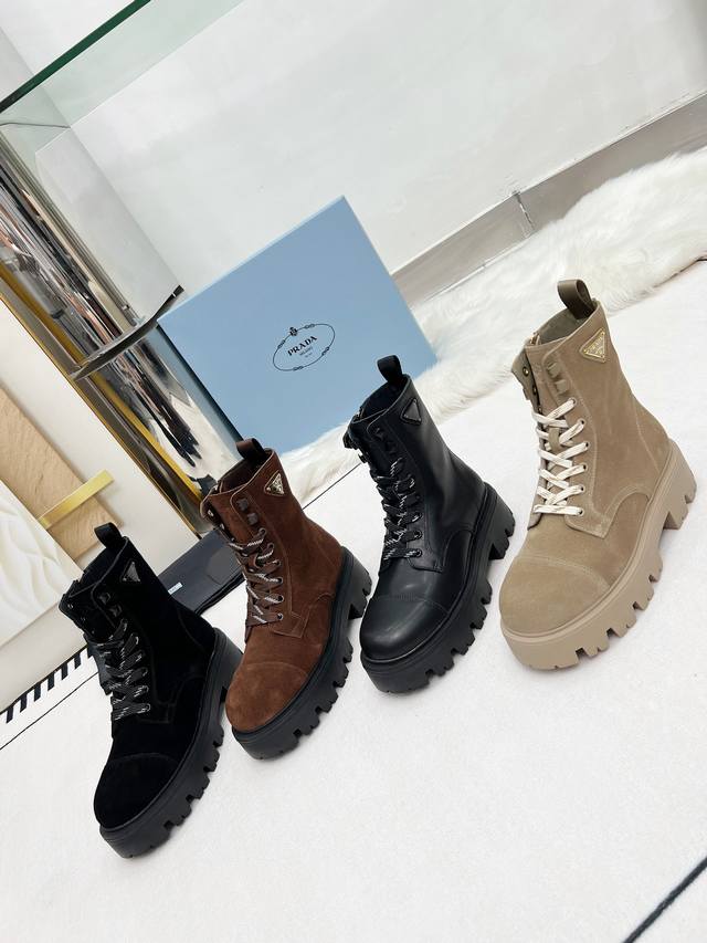 2025prada普拉达新款经典三角标厚底马丁靴 绑带加拉链设计,更好穿更好看,绝对的大爆款,上脚大气显腿瘦气质这块刚好拿捏,全系列采用多种进口材料:顶级小牛皮,高丝光牛反绒, DDD 内里水染牛里皮,尺码:35-40 41定做 。 DDD