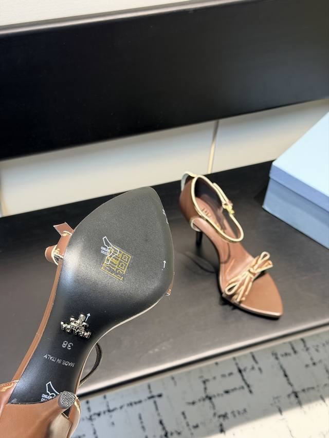 FFF 2026春款新款 Prada 普拉达 走秀款尖头凉鞋。复古老钱风高跟鞋,日常穿出高级感。尖头设计,质感高级,且有做旧效果的纹理,呈现出复古又摩登的质感,工艺精细。细高跟设计,提升穿着者气场,同时保持了较好的稳定性,适合日常通勤或特殊场合穿着。鞋面采用进口做小牛皮,内里垫脚为进口羊皮,意大利真皮大底。跟高:8.5Cm。Size:35-40 DDD