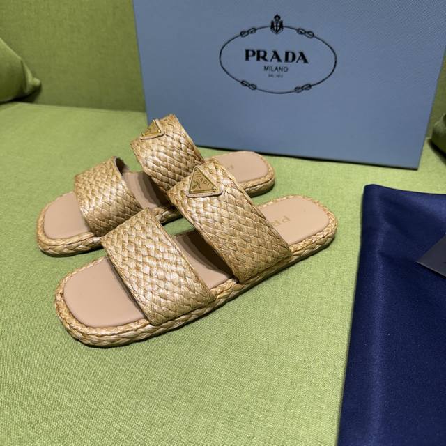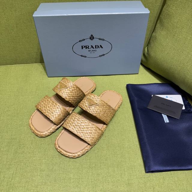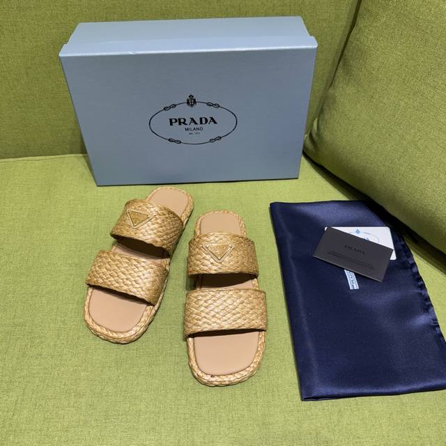 25Ss春夏新款prada普拉达绝美拉菲草鞋三角标复古草编拖鞋凉鞋,精致的编织定义了这些具有时尚设计的拉菲亚幻灯片,这款拖鞋充满夏日气息!非常百搭,夏天必入款!