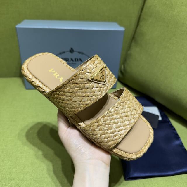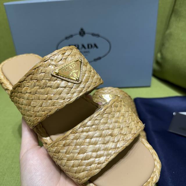 25Ss春夏新款prada普拉达绝美拉菲草鞋三角标复古草编拖鞋凉鞋,精致的编织定义了这些具有时尚设计的拉菲亚幻灯片,这款拖鞋充满夏日气息!非常百搭,夏天必入款! DDD 鞋面:拉菲草 DDD 内里垫脚:羊皮 DDD 鞋底底:原版橡胶防滑大底 DDD 码数:35-42 40.41.42定做不退换 DDD 出厂价pp: DDD