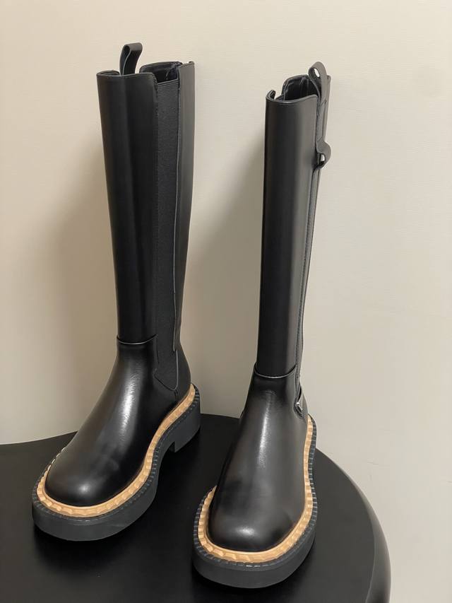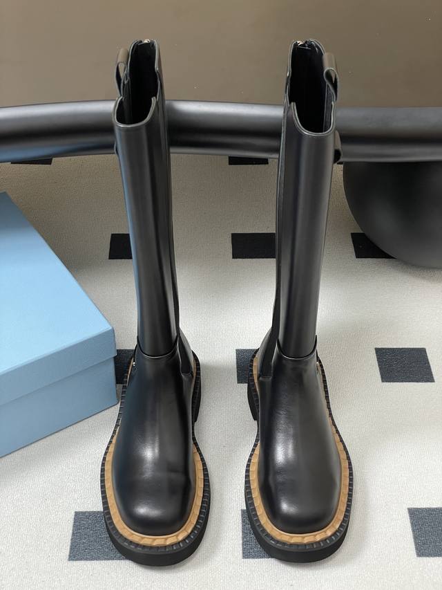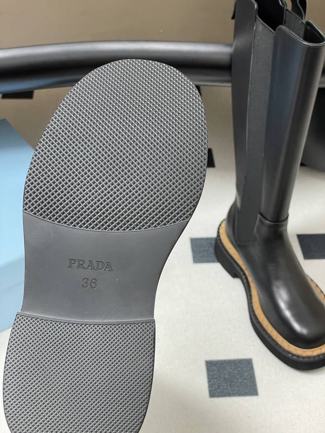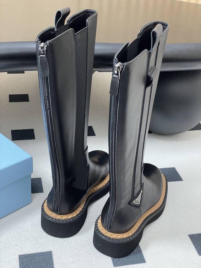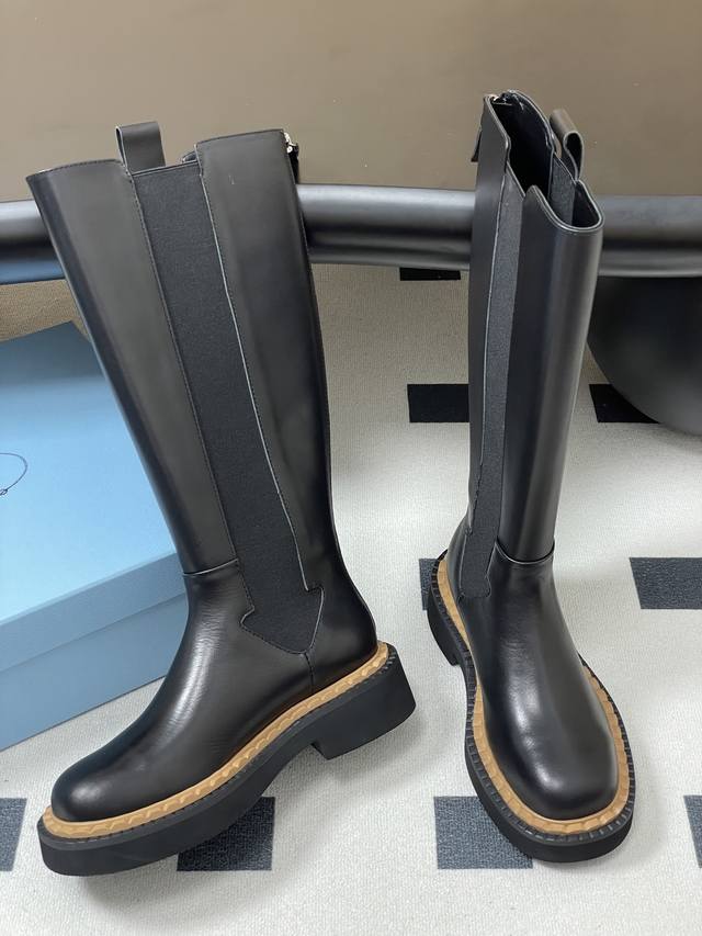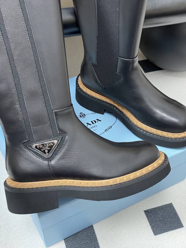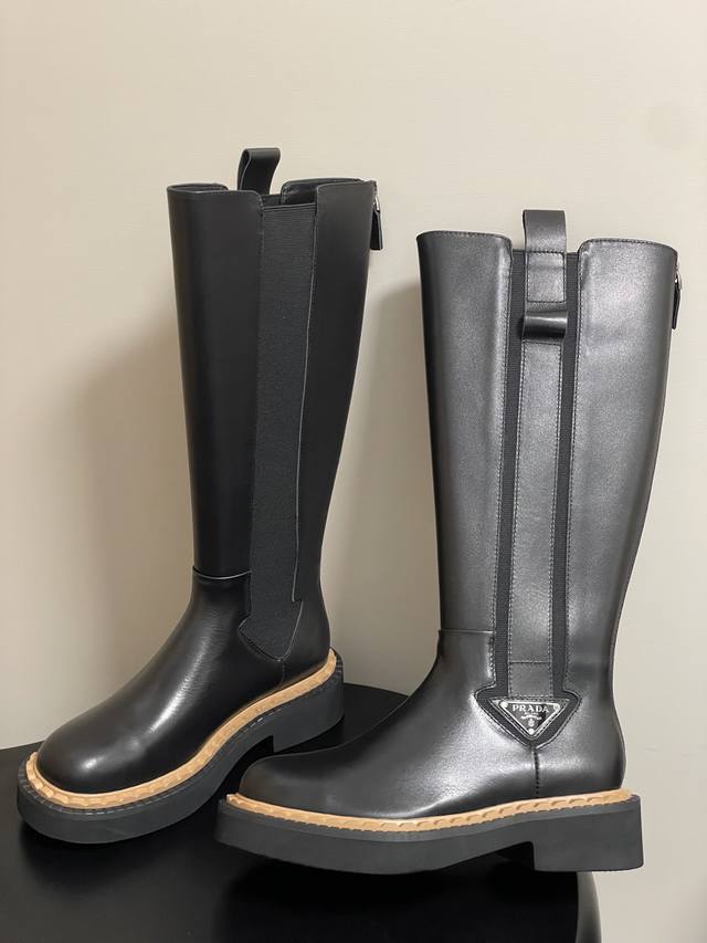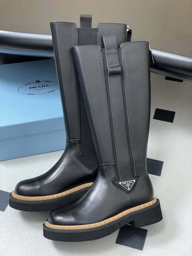 25Ss秋冬新款Prada普拉达三角标直筒长靴骑士靴锯齿厚底松紧靴