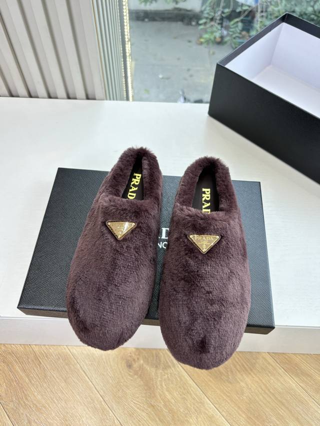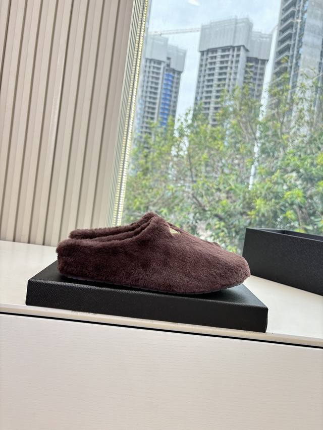 批 prada 普拉达 新品三角标秋冬厚底穆勒包头毛毛拖鞋 材质与工艺: 进口羊京面 原版定制进口羊皮毛一体 170%真羊毛 保暖神器...