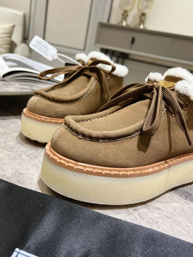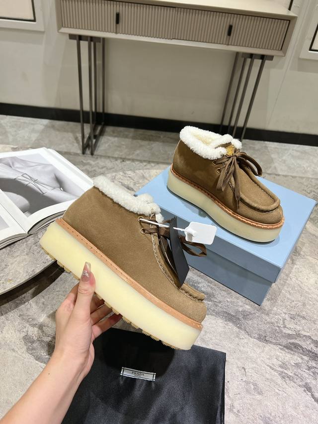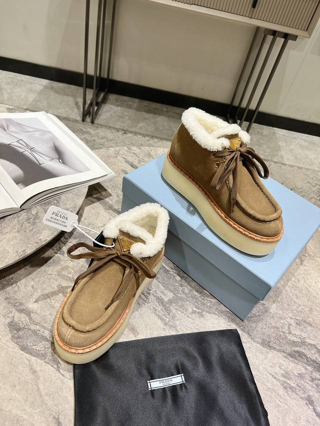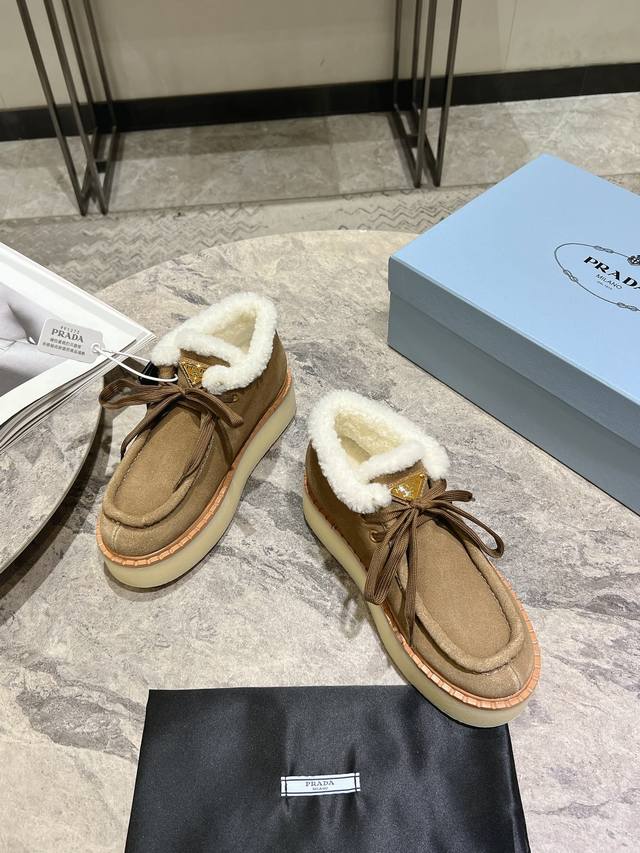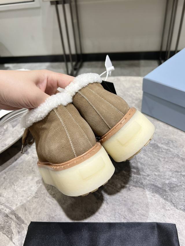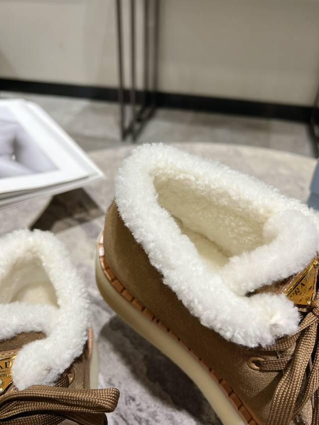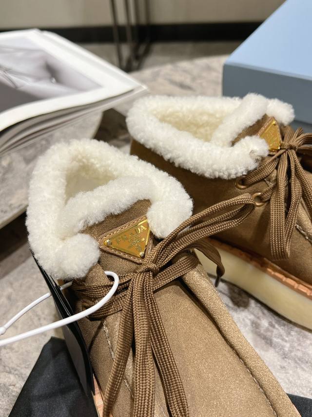 Parda# 普拉达秋冬新款△三角标厚底靴 系带雪地靴 双色擦色牛绒真羊羔毛 真皮沿条 双色Tpu大底 Size:35-39 40 41定做不退换