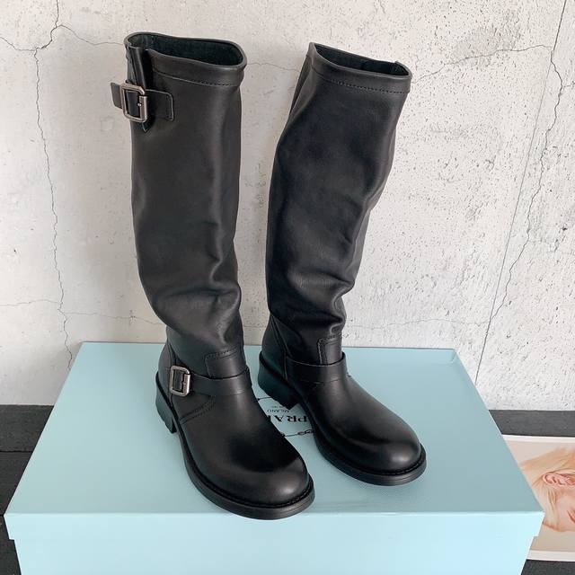 Prad*2025秋冬新款复古百搭堆堆靴,超自然的叠堆感,实穿性很强的一款靴子,贯穿春秋冬三季,简约大气,松弛感满满对版树脂油膏小牛皮面料,水染牛皮内里,意大利进口真皮注塑组合大底,码数:35-39# 40#订做不退换