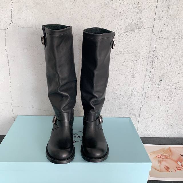 Prad*2025秋冬新款复古百搭堆堆靴,超自然的叠堆感,实穿性很强的一款靴子,贯穿春秋冬三季,简约大气,松弛感满满对版树脂油膏小牛皮面料,水染牛皮内里,意大利