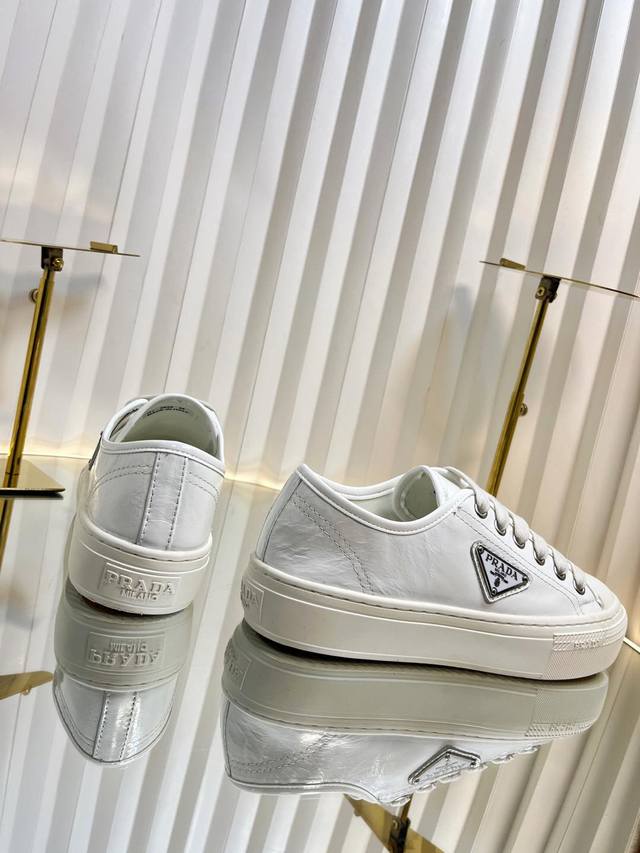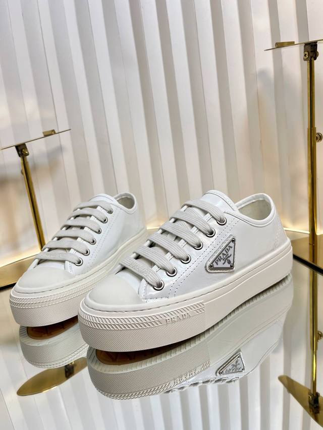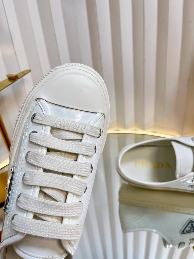 Prada新款软漆皮饼干鞋小白鞋,时髦到炸天 非常百搭的款式 太好看了吧 上脚轻盈而且舒服 三角标漆皮面 比传统的帆布鞋好打理很多,垫脚牛皮,进口Tpu模具大底