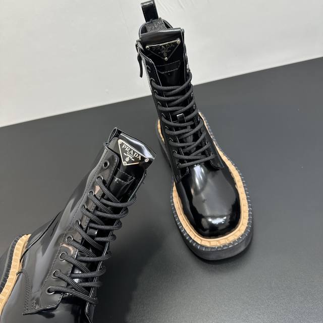 Prada普拉达倒三角标厚底系带短靴 超级好看,修腿显细。