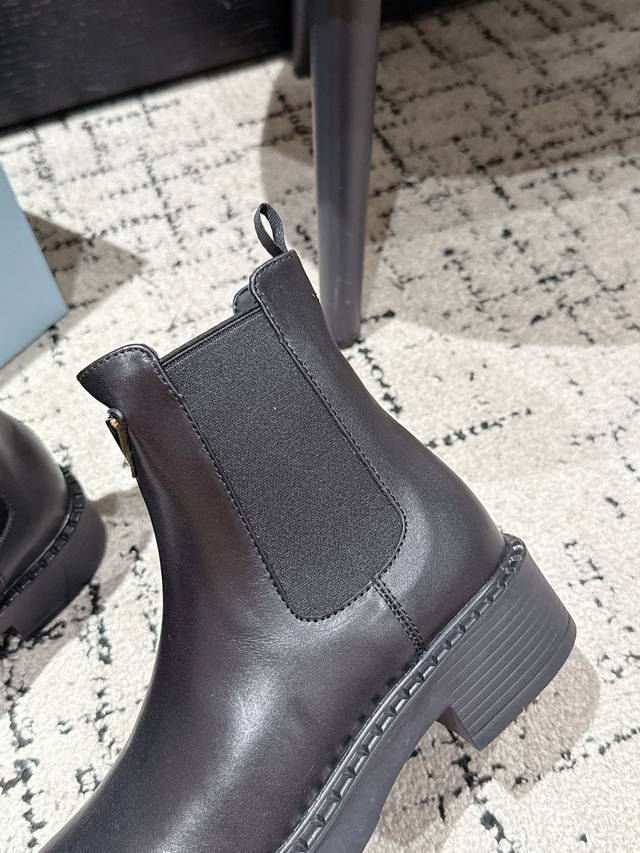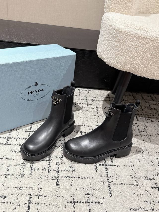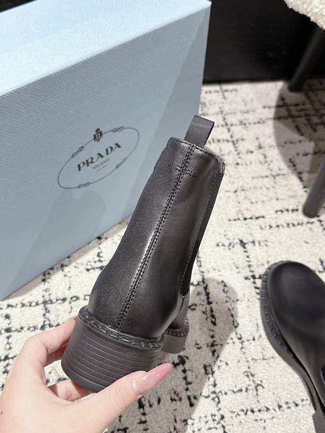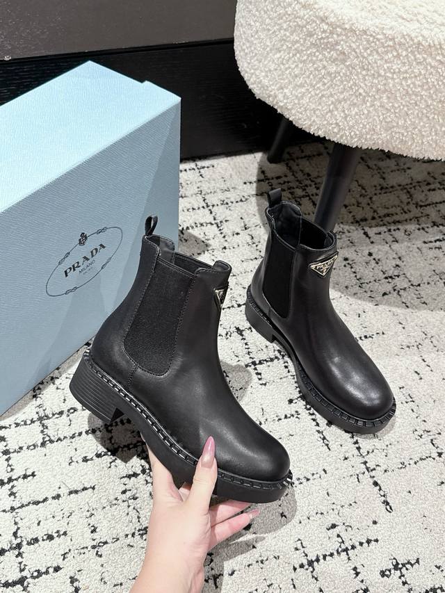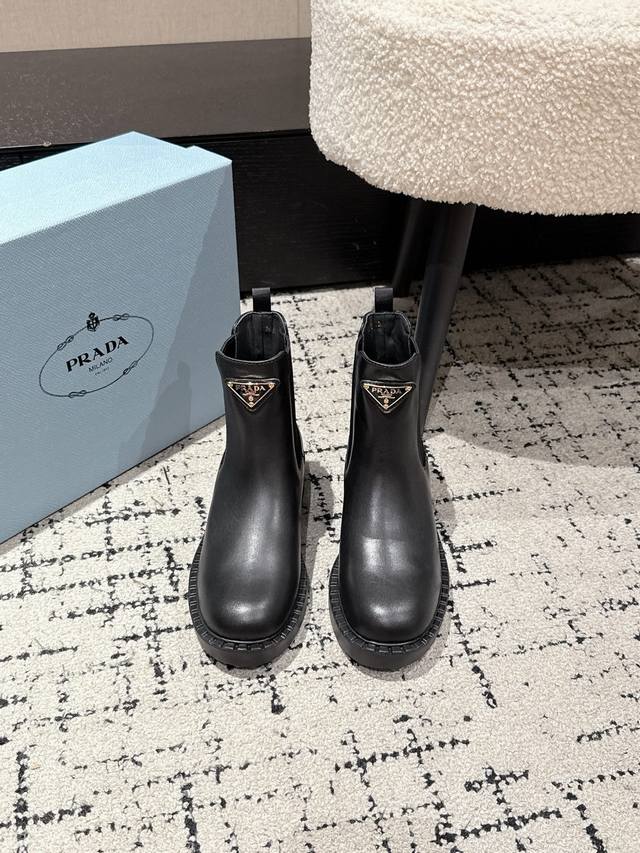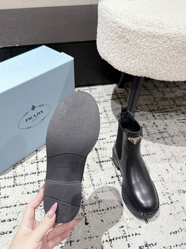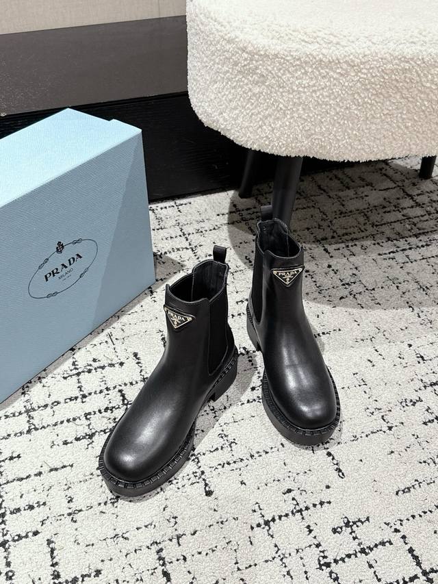 prada普拉达厚底复古马丁靴 橡筋松紧 经典厚底 搭配三角扣 简约大气时尚百搭。 面料进口小牛皮 内里垫脚透染羊皮柔软细腻,脚感舒适 橡胶模具防滑轻便大底 标