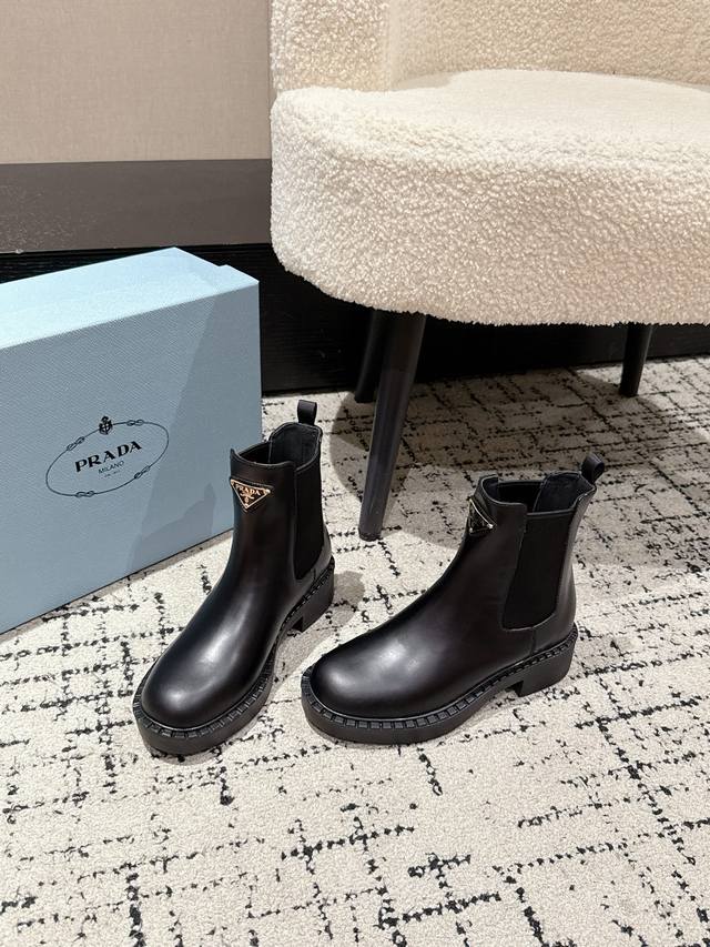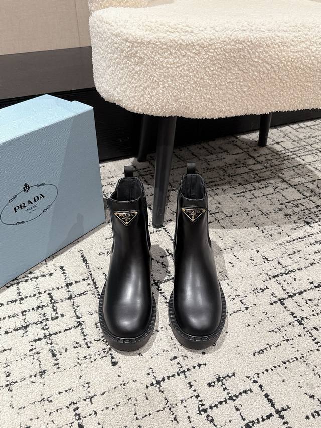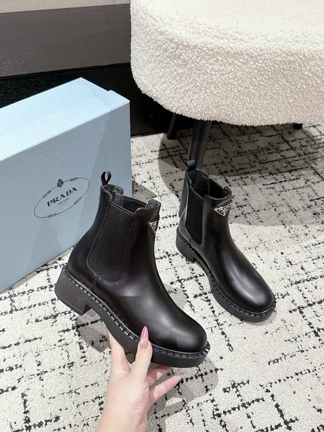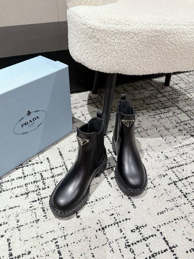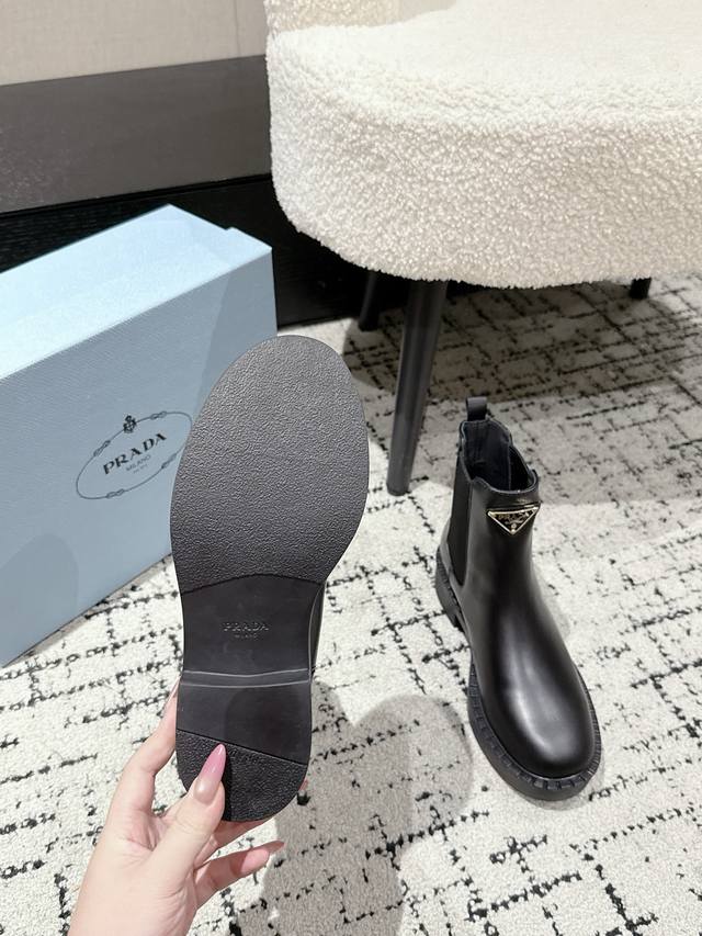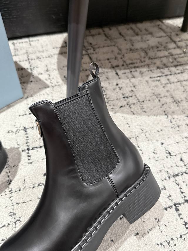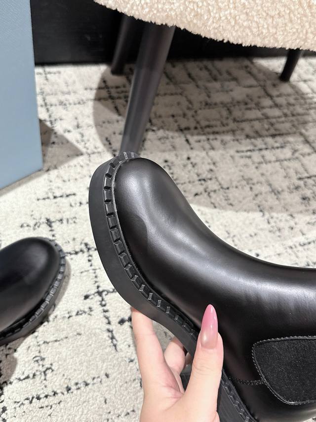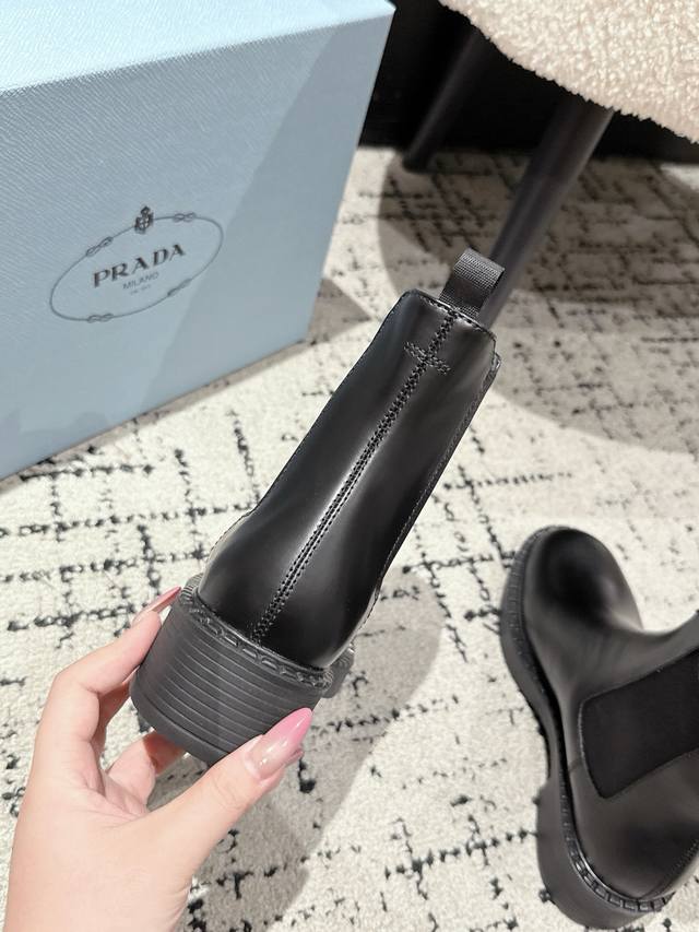 prada普拉达厚底复古马丁靴 橡筋松紧 经典厚底 搭配三角扣 简约大气时尚百搭。 面料进口开边珠牛皮 内里垫脚透染羊皮柔软细腻,脚感舒适 橡胶模具防滑轻便大底