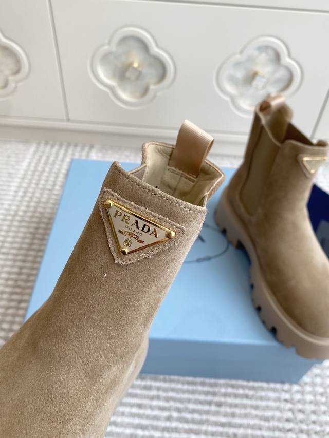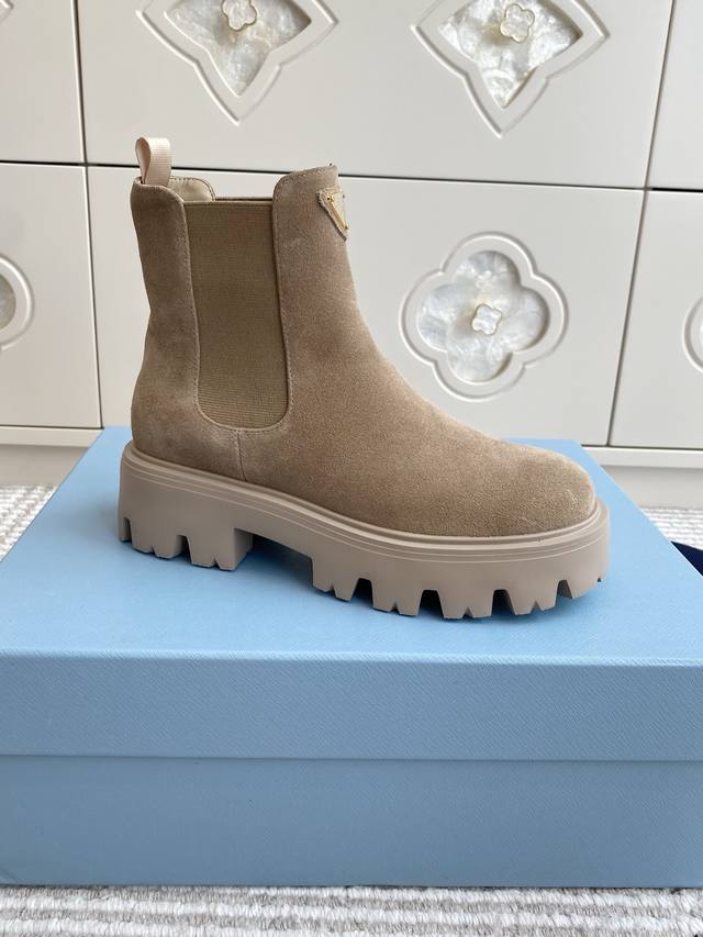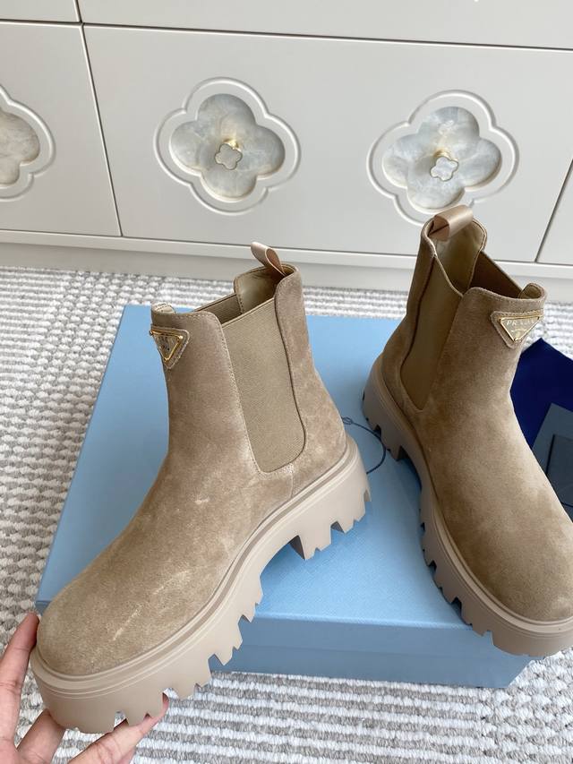 prada普拉达新款厚底切尔西短靴 DDD 顶级品质 DDD 精致线条与工艺构造定义此款皮革短靴,饰有标志性三角形徽标。独特的金属搭扣为机车风格增添个性,搭配厚实橡胶鞋底。 DDD 鞋面:进口牛皮 牛反绒 DDD 内里:羊皮 DDD 原版开模胎面花纹橡胶大底 DDD Size:35-39 40.41.42定制不退换 DDD