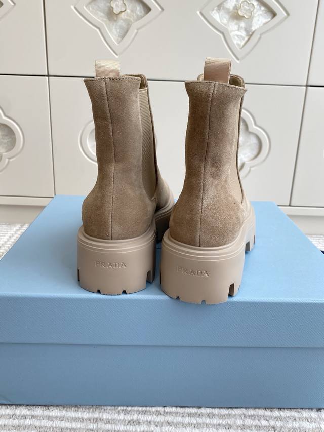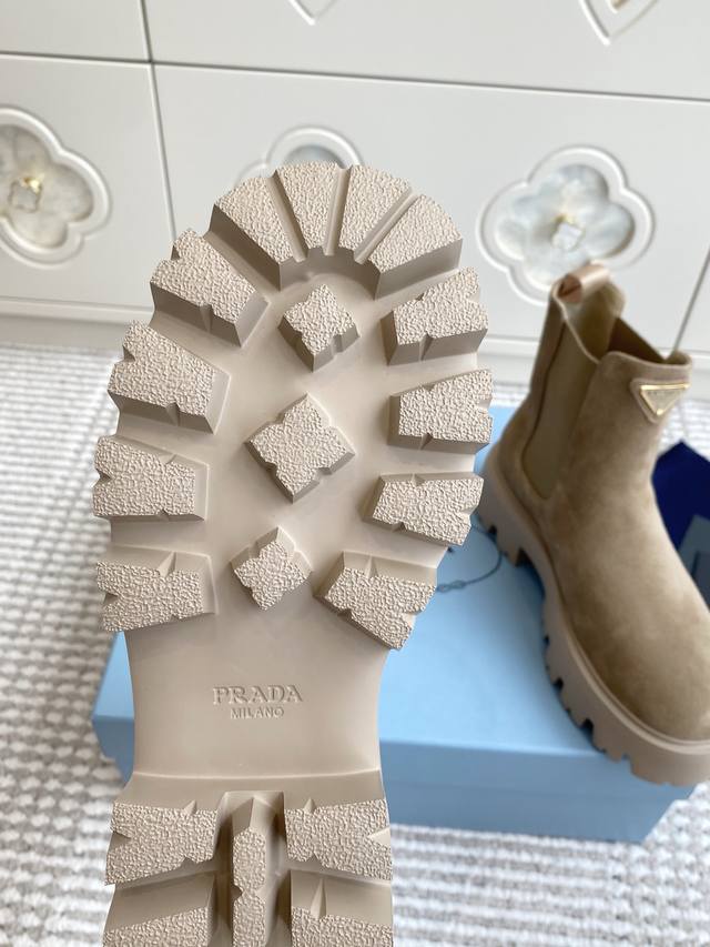 / prada普拉达新款厚底切尔西短靴 顶级品质 精致线条与工艺构造定义此款皮革短靴,饰有标志性三角形徽标。独特的金属搭扣为机车风格增添个性,搭配厚实橡胶鞋底。 鞋
