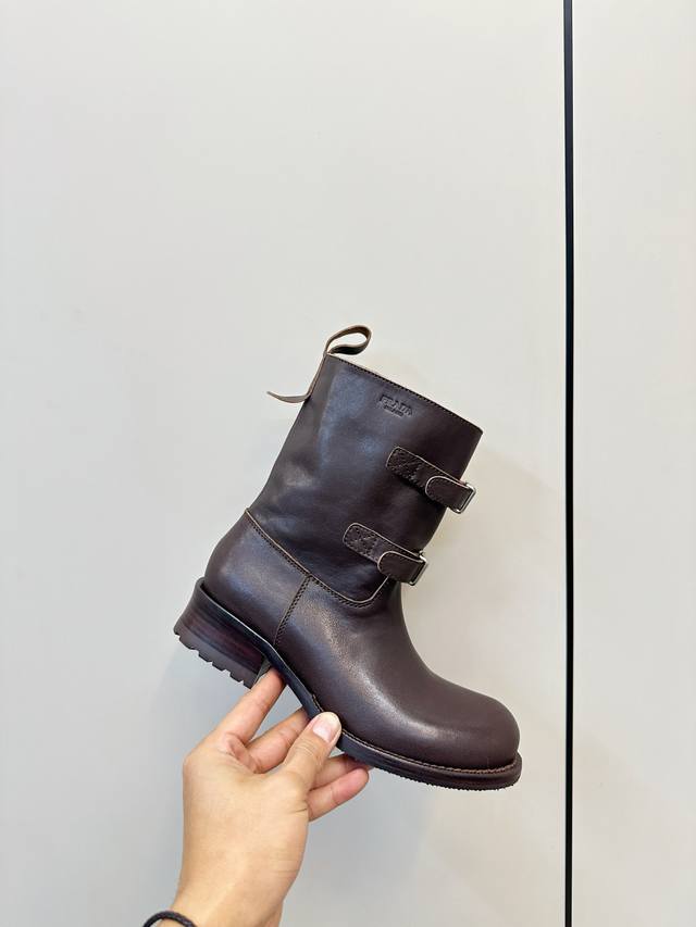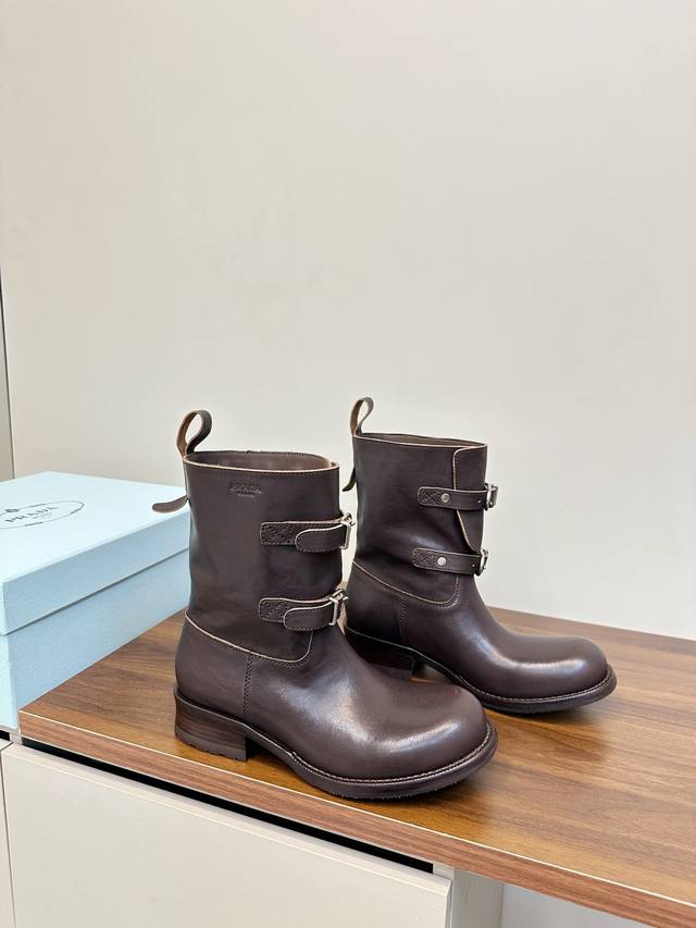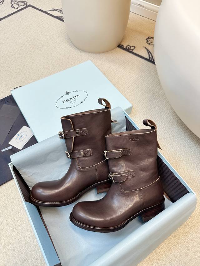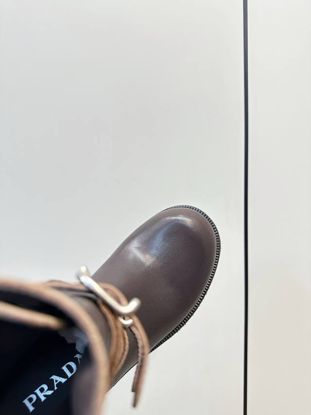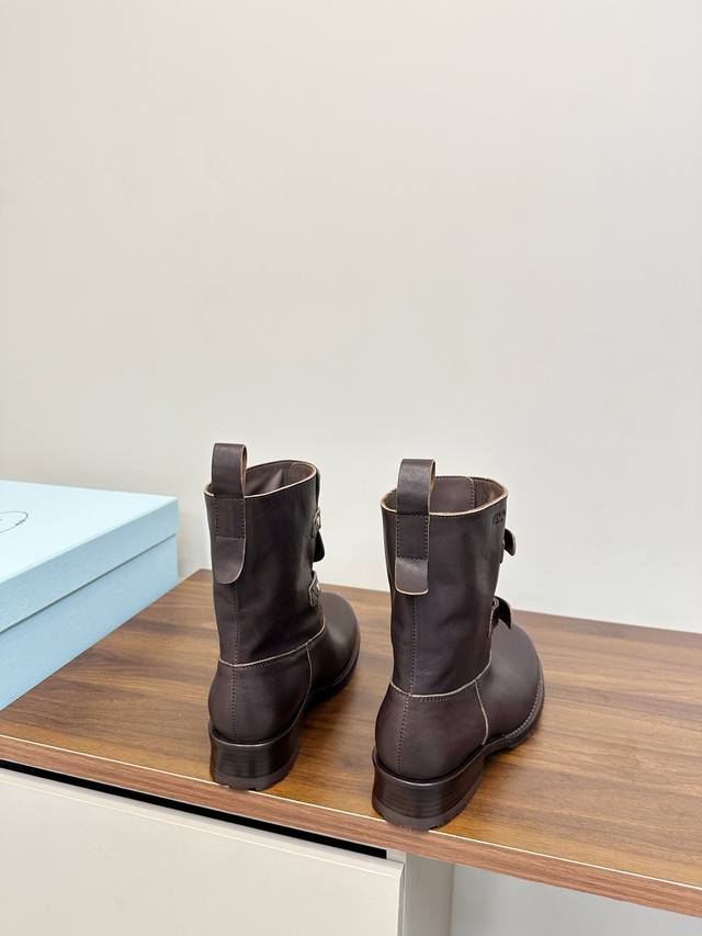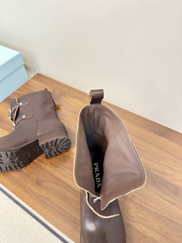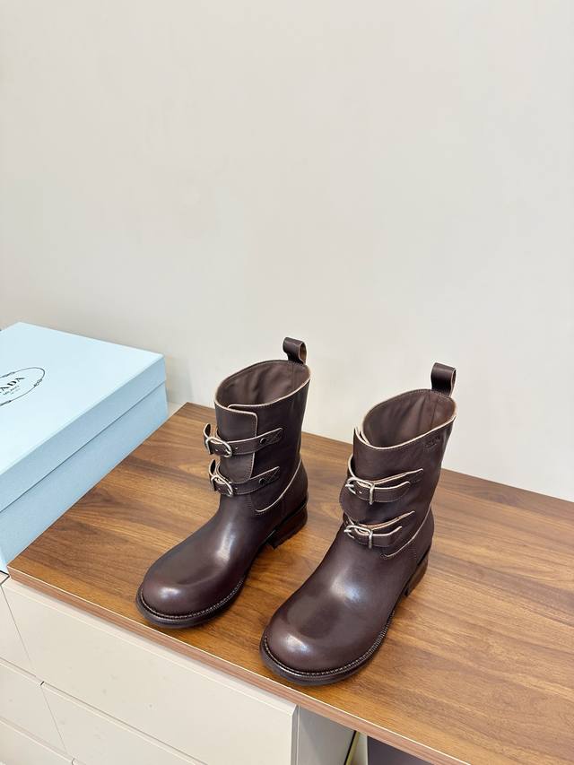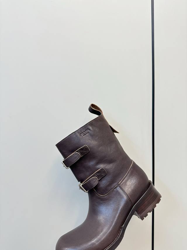 prada 普拉达双扣带马丁靴 时尚堆堆靴 松垮短靴 prada 2025秋冬双扣带西部堆堆靴,选用植鞣水洗小牛皮,质感柔软有褶皱,复古做旧超有氛围感 。靴筒双