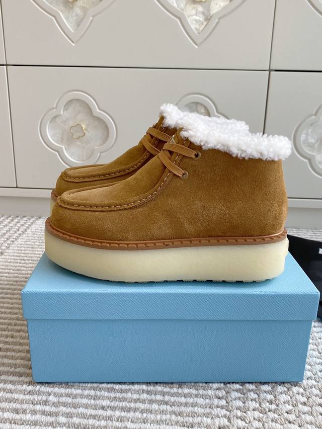 / prada 普拉达 新品三角标厚底羊毛雪地靴 高帮绑带短靴 材质与工艺: 原版定制进口羊皮毛一体 170%真羊毛 保暖神器 Zp开模大底 Size:35-39