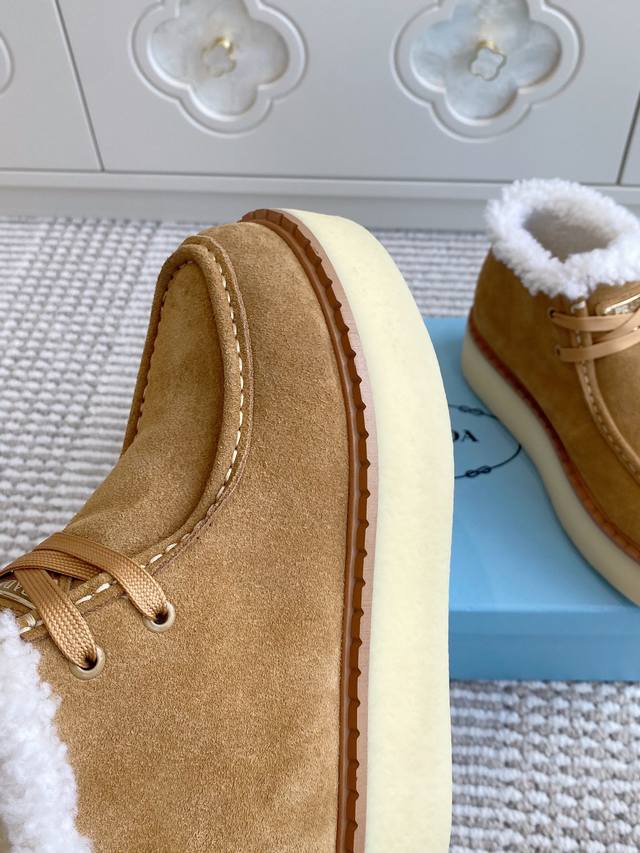 prada 普拉达 新品三角标厚底羊毛雪地靴 高帮绑带短靴 材质与工艺: 原版定制进口羊皮毛一体 170%真羊毛 保暖神器 Zp开模大底 Size:35-39