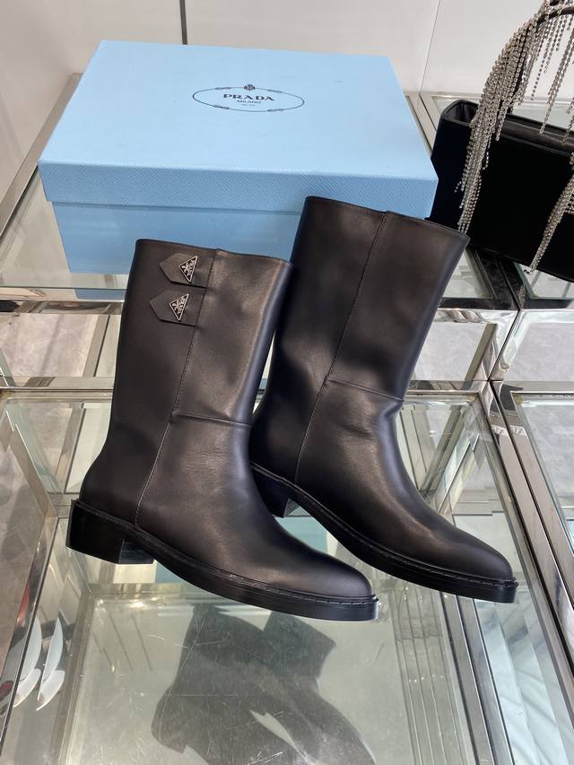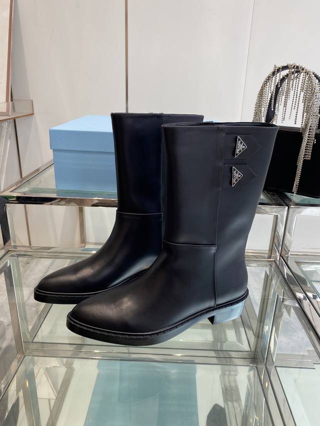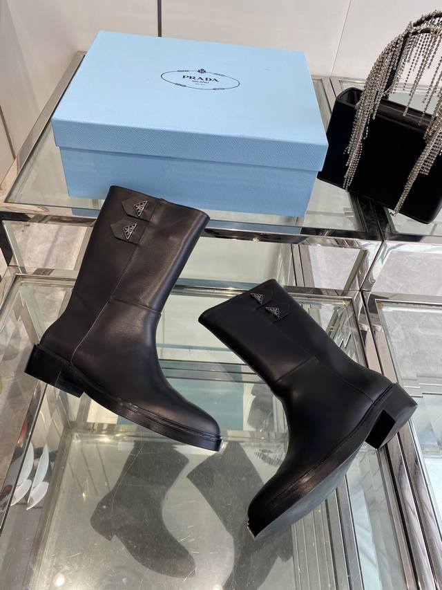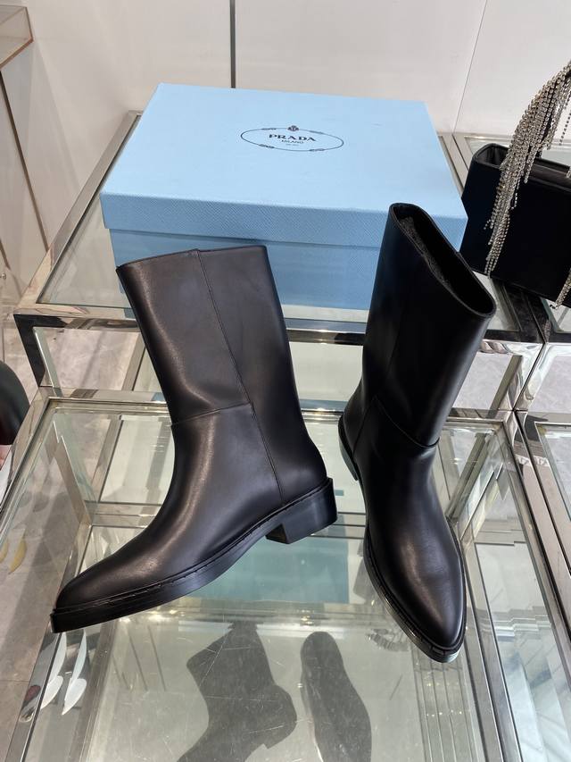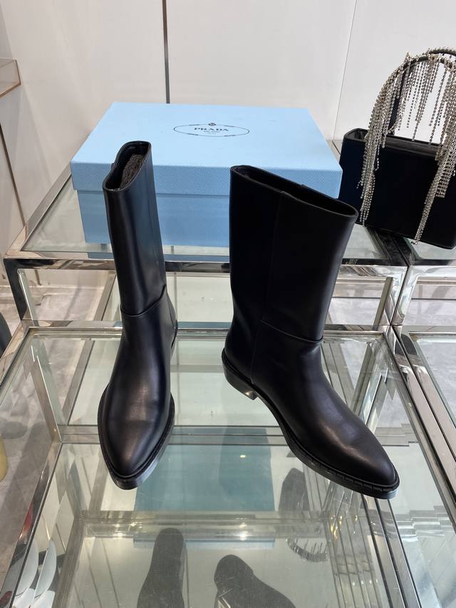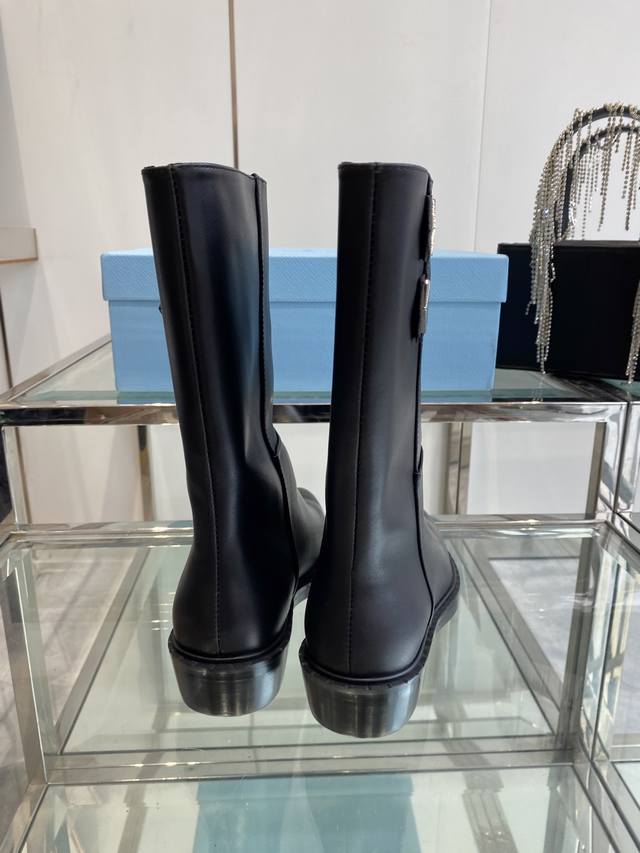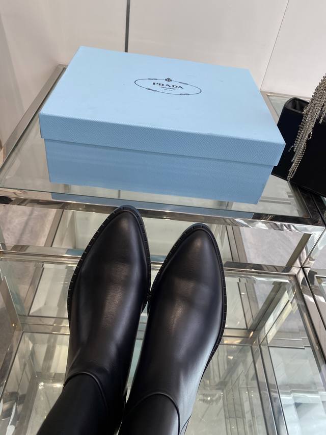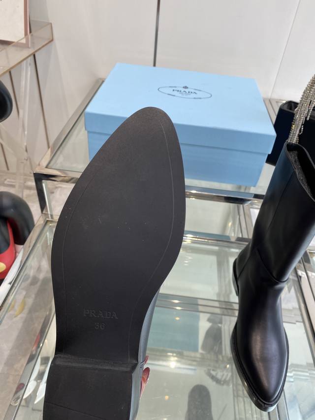 Prada 普拉达 秋冬新款三角标尖头靴 Prada能在重要场合用得上了 清新风带点小贵气的感觉 上脚非常完美 显腿瘦气质这块刚好拿捏 优雅大方晶莹透剔 各种配